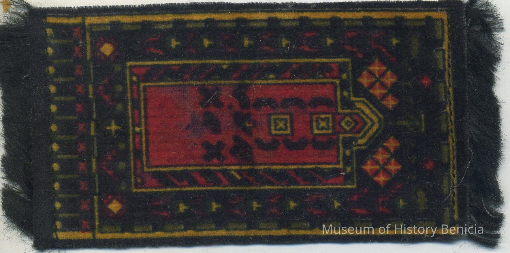 Small rug-like piece, fuzzy on one side with fringe on two short ends. Black with red and green and yellow prayer rug design. Black fringe. Stamped on back "St.Leger Little Cigars, Factory 493 Dist. MD."