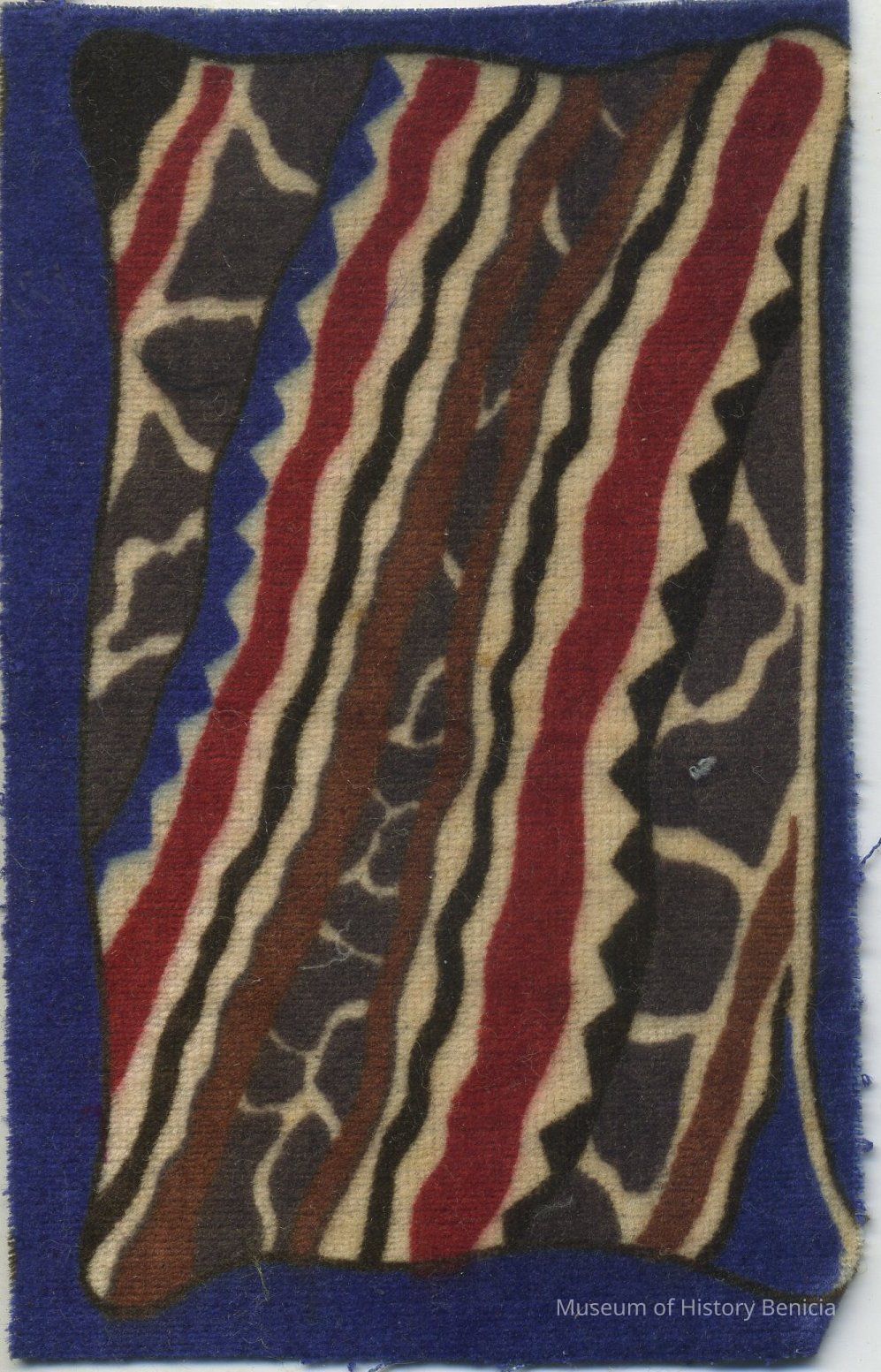 Rectangle of cloth, fuzzy on one side; blue edges with irregular diagonal designs in green, red, brown; stamped on back: "Factory No. 30 2nd Dist. N.Y."
