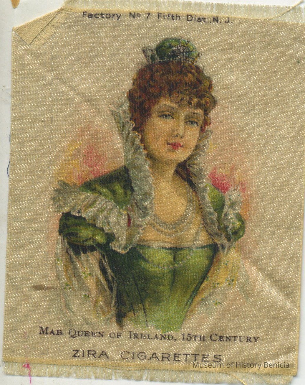 Silky square printed with with bust of woman in green and "Mab Queen of Ireland 15th Century" and "Zira Cigarettes" printed on the background; at bottom: