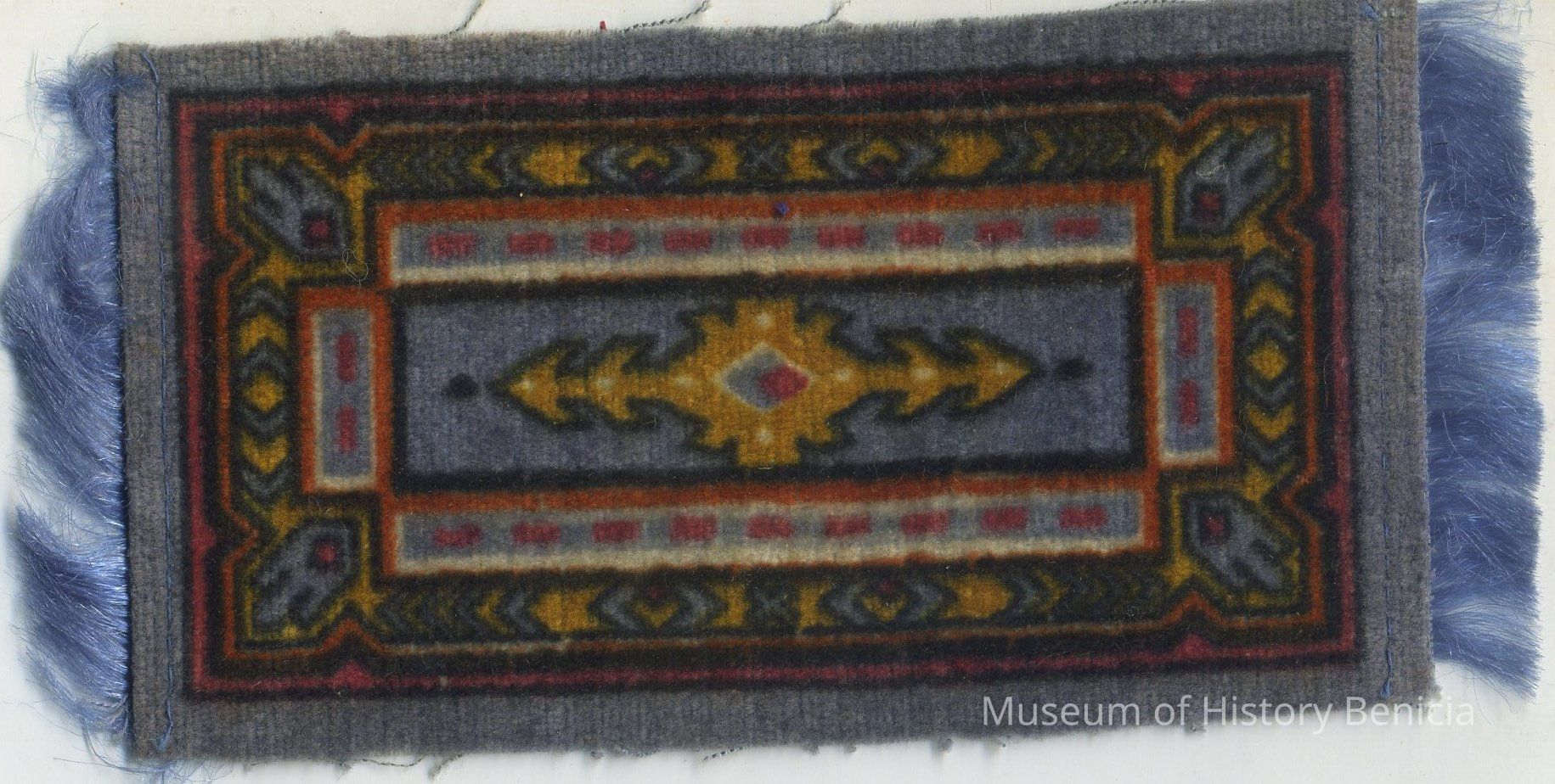 Small rug-like piece, fuzzy on one side with fringe on two short ends. Medium blue with geometric patterns in red, gold, white, blue and black. Stamped on back: "Factory No. 30 2nd Dist. N.Y."