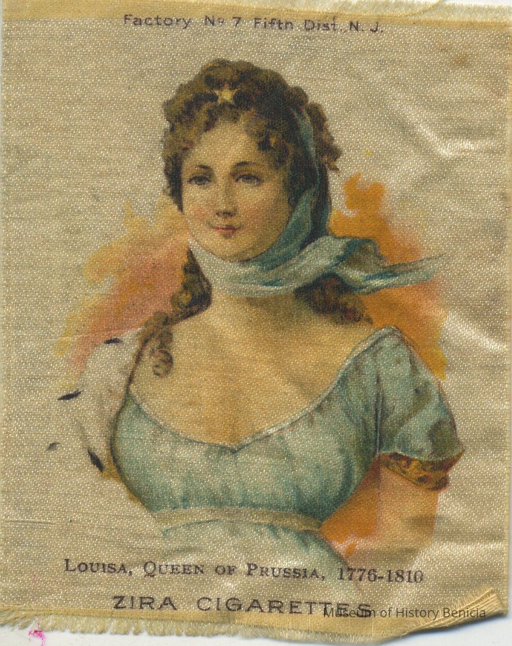 Silky square printed with with bust of woman in blue and "Louisa, Queen of Prussia, 1776-1810" and "Zira Cigarettes" printed on the background; at bottom: