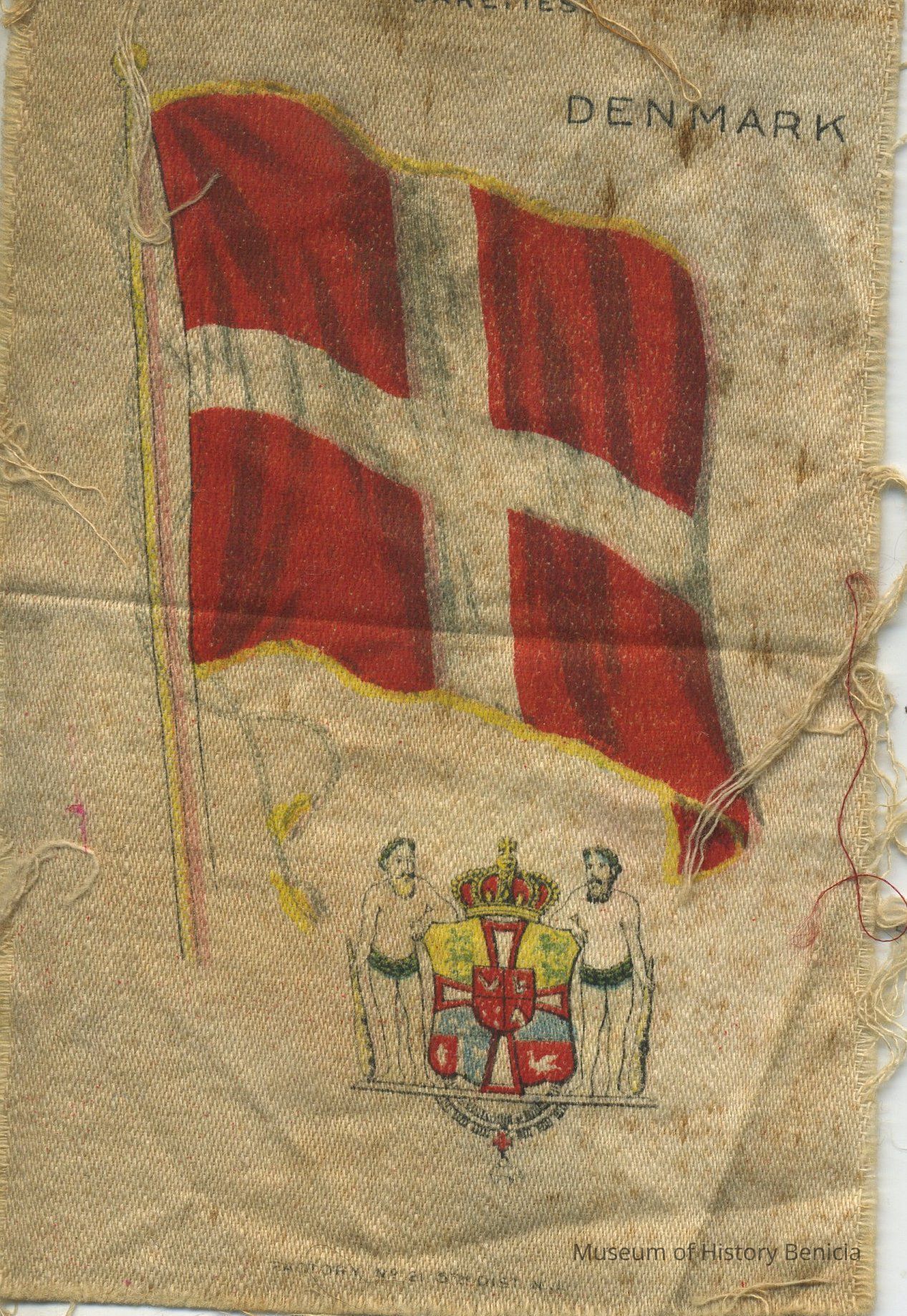 Silky rectangle printed with red flag with a white cross,"Denmark" "Nebo Cigarettes" and crest printed on the background; at bottom: "Factory No. 21 5th Dist. N.J."