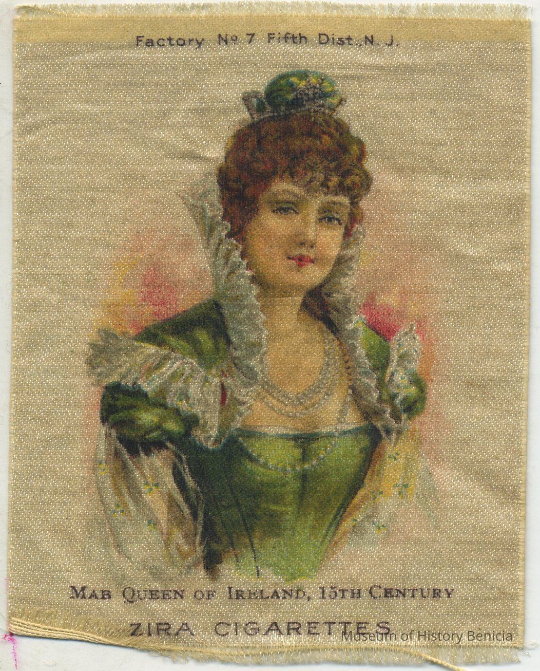 Silky square printed with with bust of woman in green and "Mab Queen of Ireland 15th Century" and "Zira Cigarettes" printed on the background; at bottom: