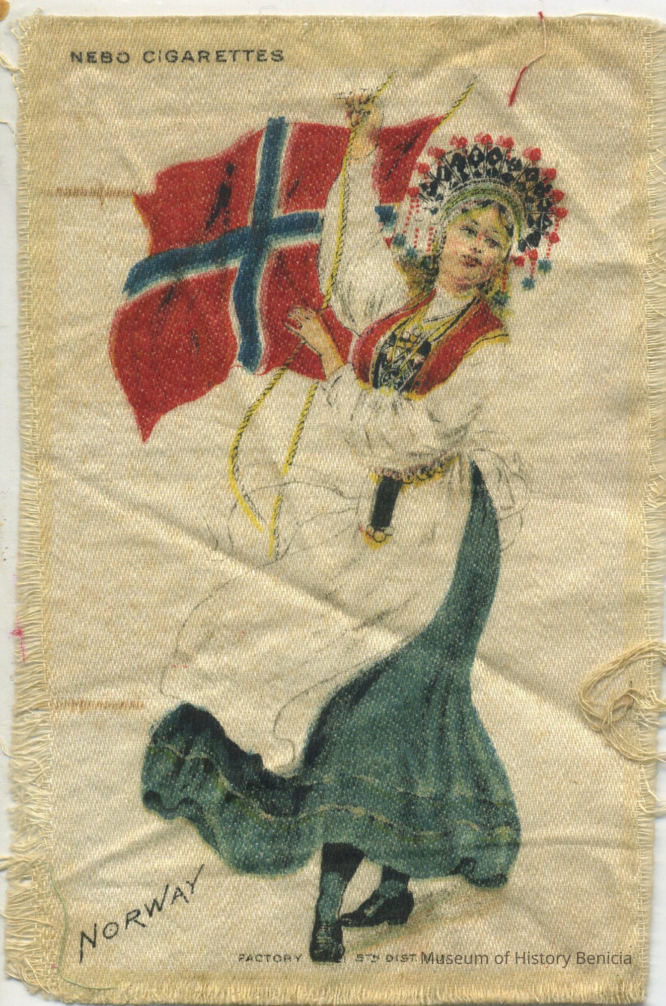 Silky rectangle printed with girl in red/blue with white apron and red/blue cross flag and "Norway" and "Nebo Cigarettes" printed on the background; at bottom: "Factory No. 7 5th Dist. N.J."