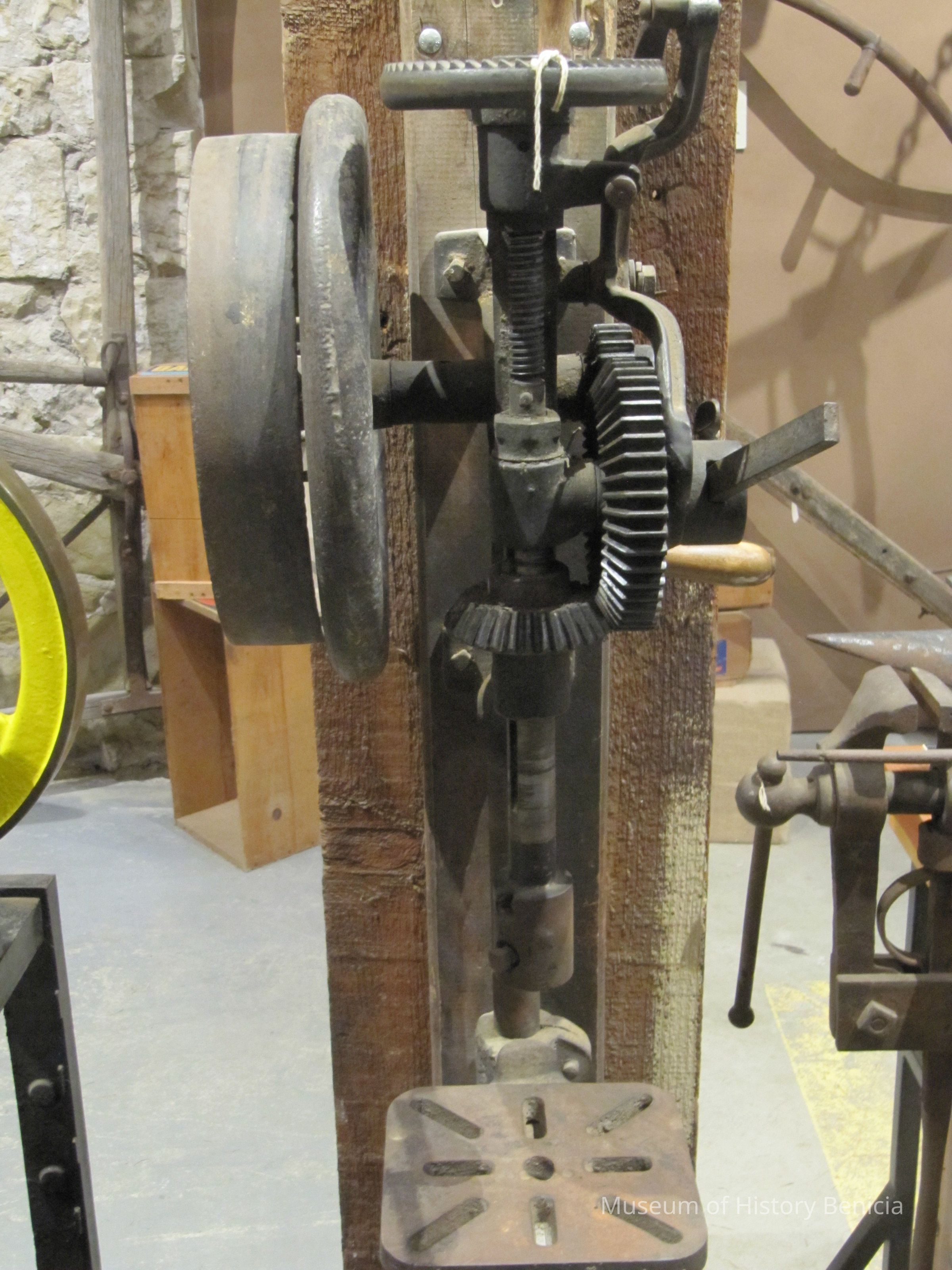 Drill press, hand crank with power wheel for belt drive. Wall mount board included. The unit is complete