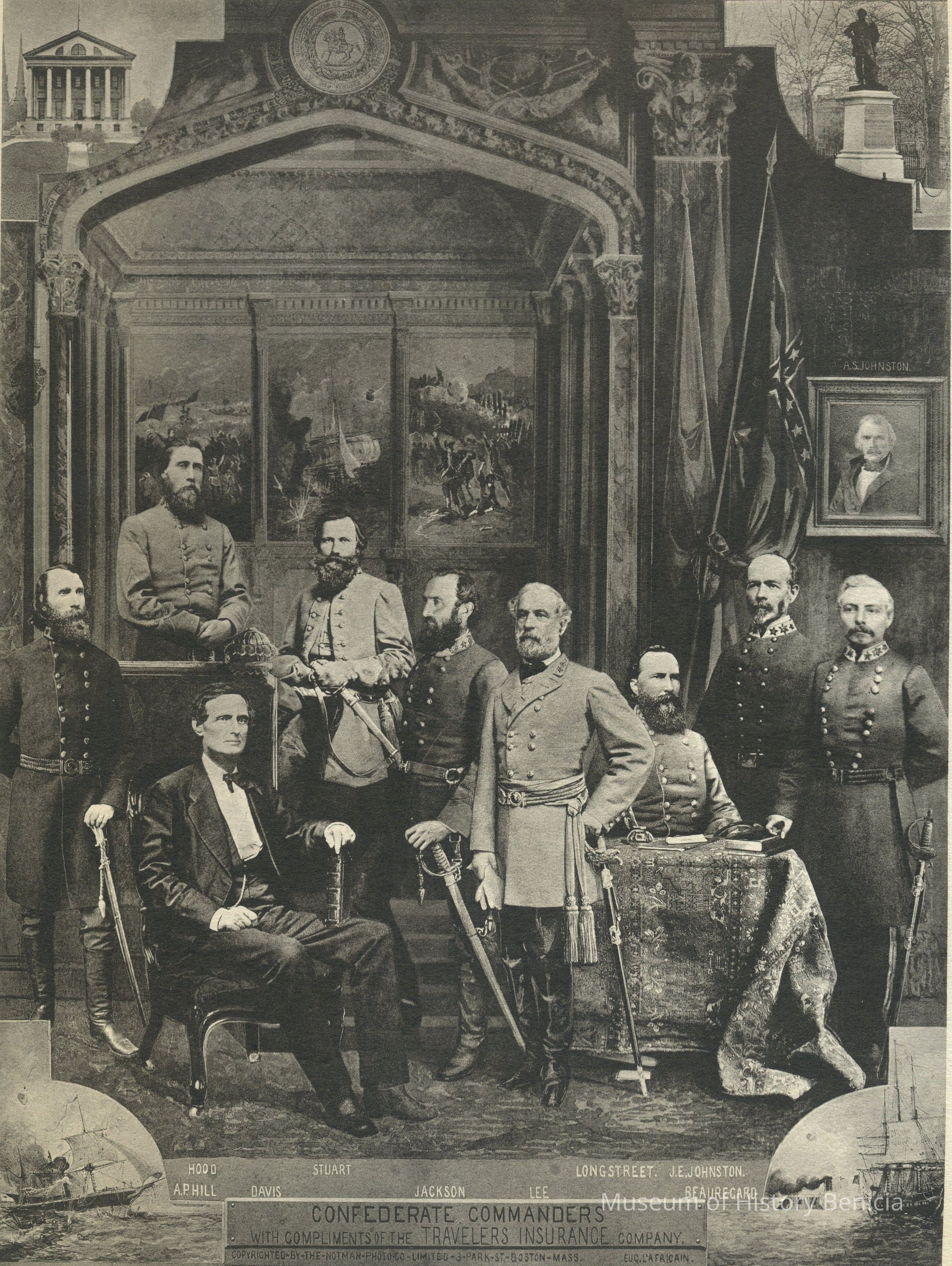The men are identified left to right: A.P. Hill, Hood, Davis, Stuart, Jackson, Lee, Longstreet, J.E. Johnston, and Beauregard, and a photo to the right is identified as A.S. Johnston;