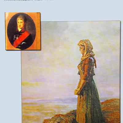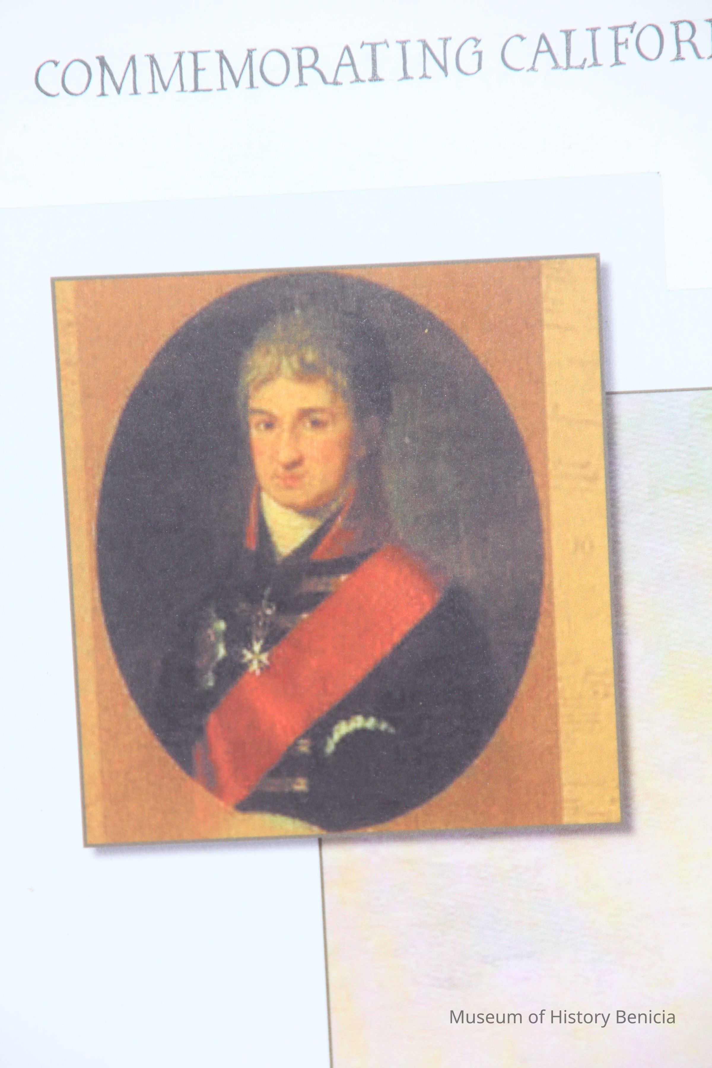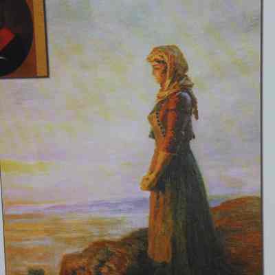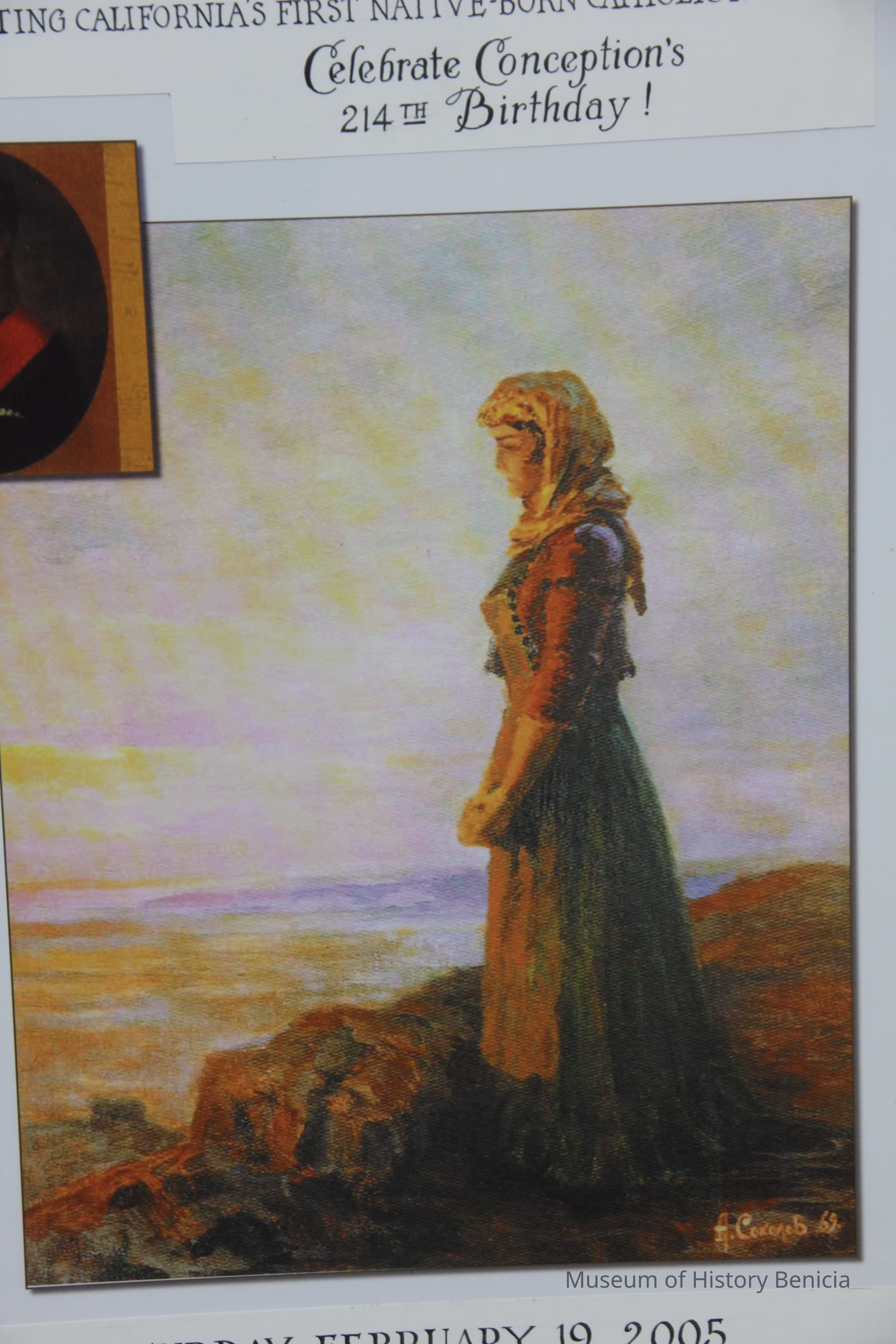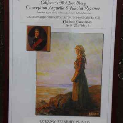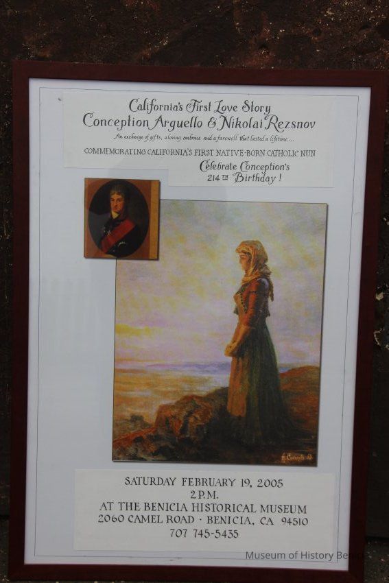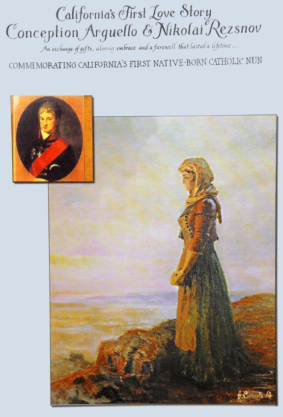Print of Concepcion Arguello standing facing the Sea. Canvas-like material framed in black and gold. Signed A. cokojob '69 in right corner. Small gold plaque A. Sokoloff 1891-1971-Collection