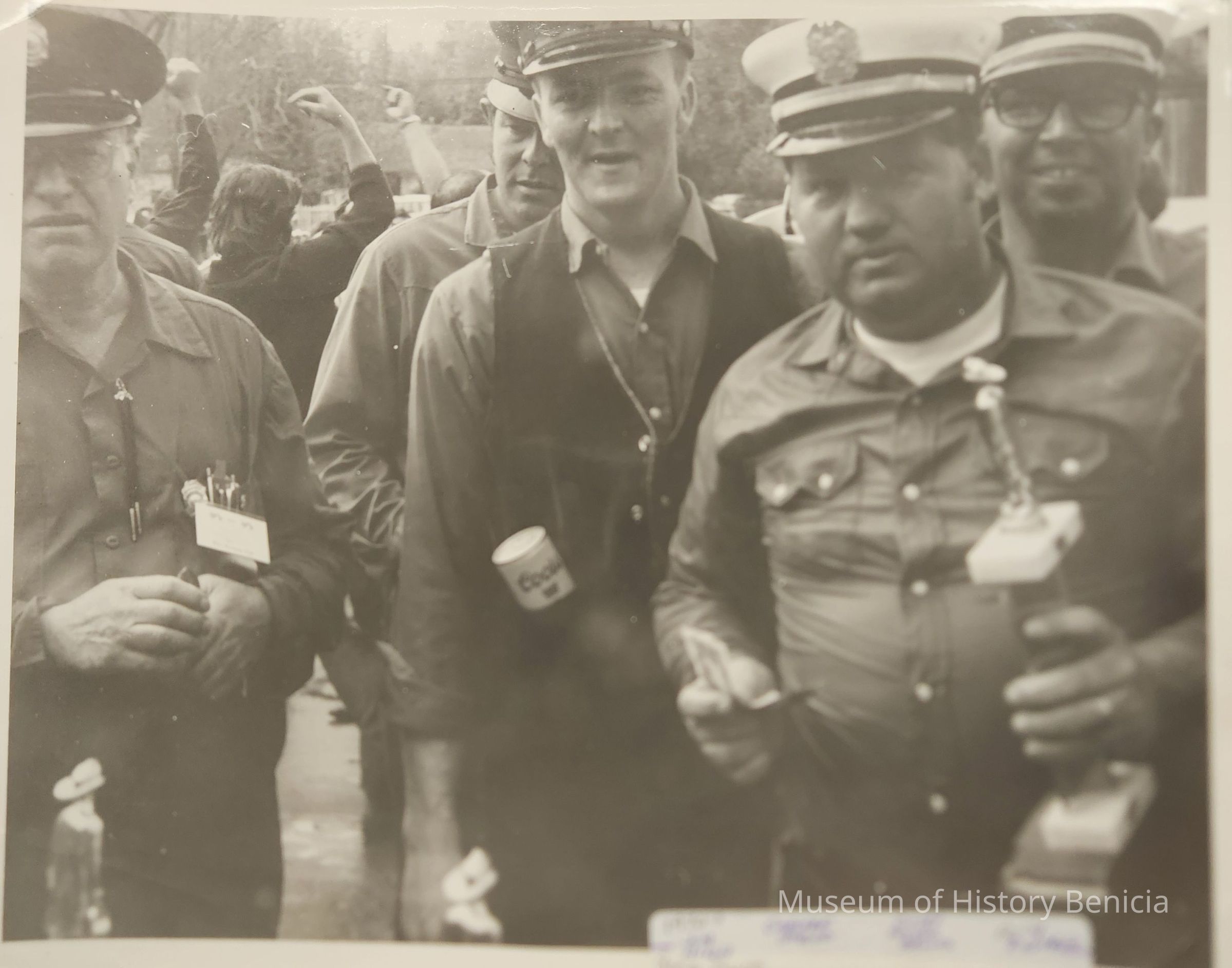 B/W Photograph of five firemen at a muster, one is holding a trophy.