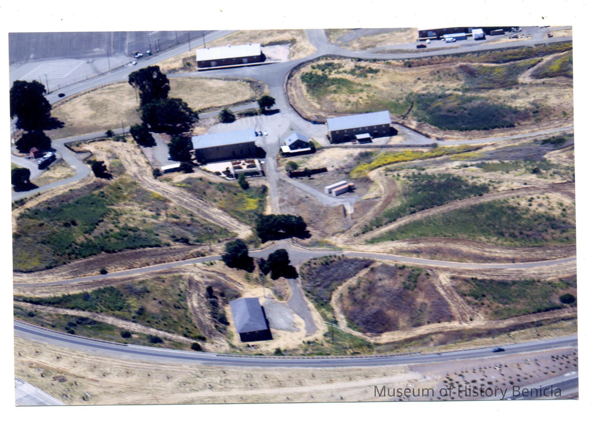 This is a color ariel photo of the area around the Museum of History Benicia, circa 2015. Building 7, 8, 9 and 10 are pictured.