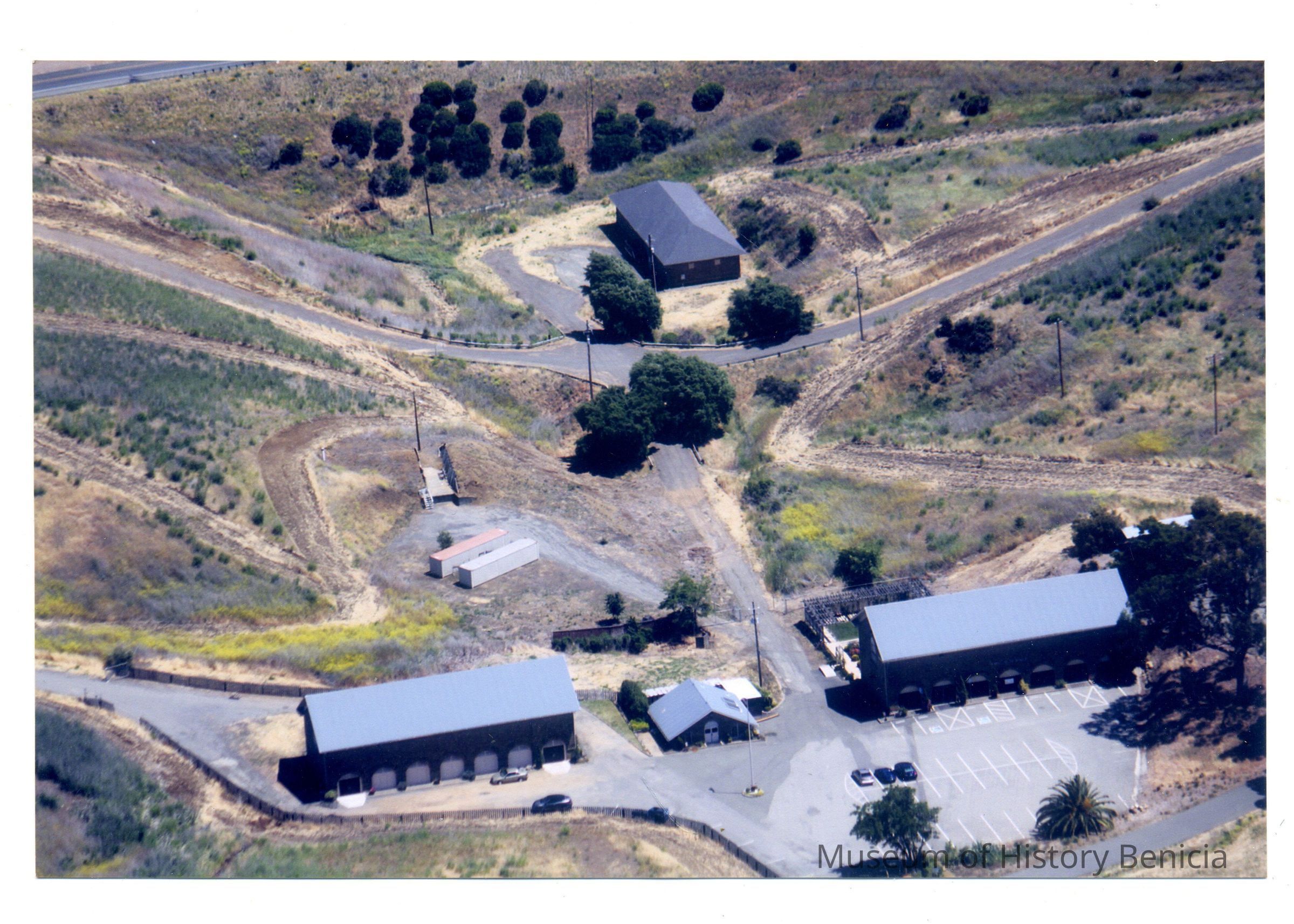 This is a color ariel photo of the area around the Museum of History Benicia, circa 1970. Building 7, 8, 9 and 10 are pictured.