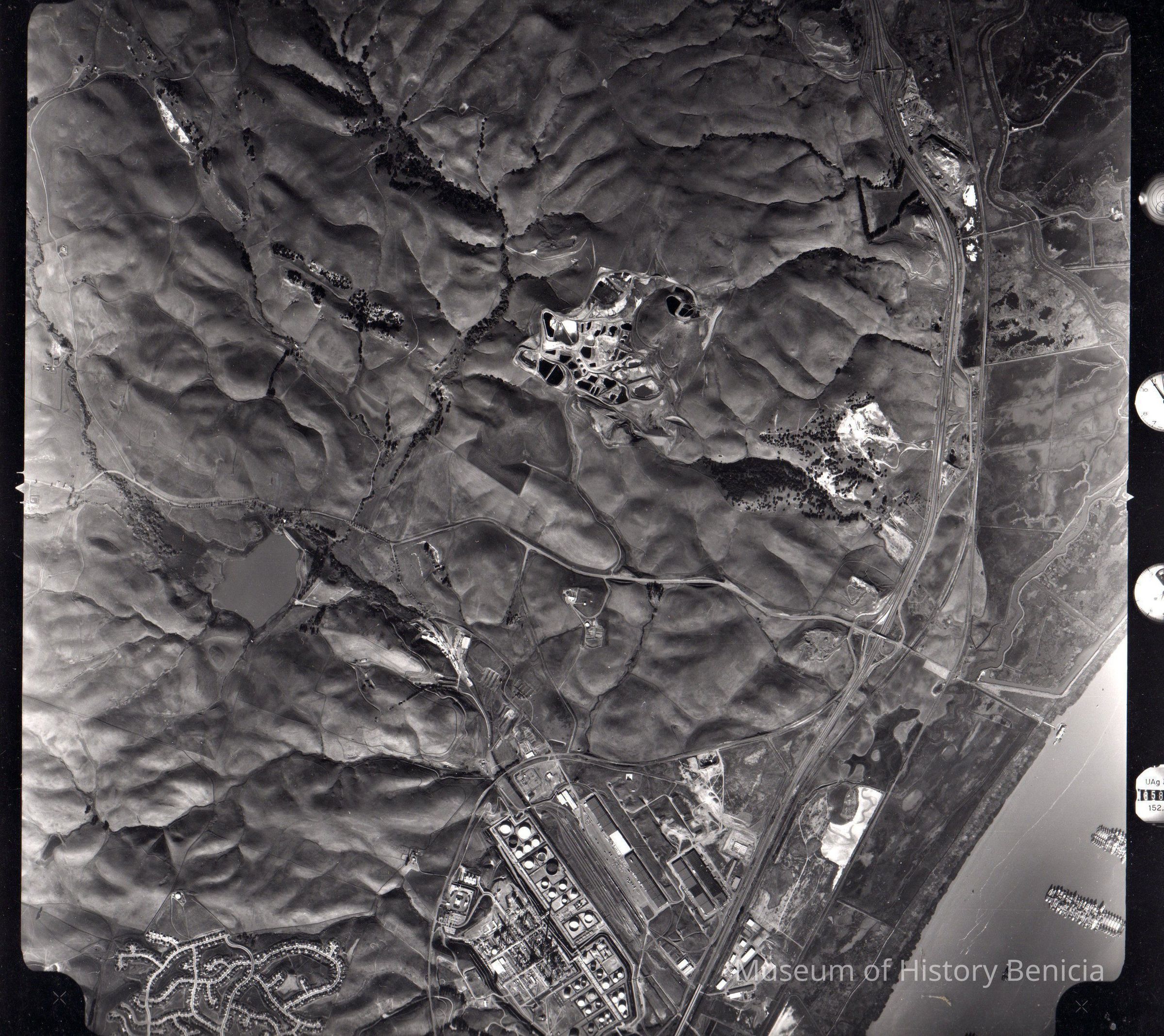 B/W aerial view showing I.T. Corp. toxic waste dump at center of photo.