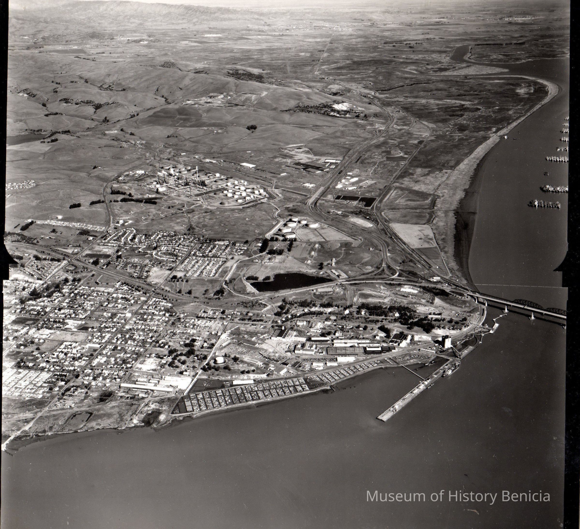 B/W aerial view showing Benicia city and Benicia Industrial Park.