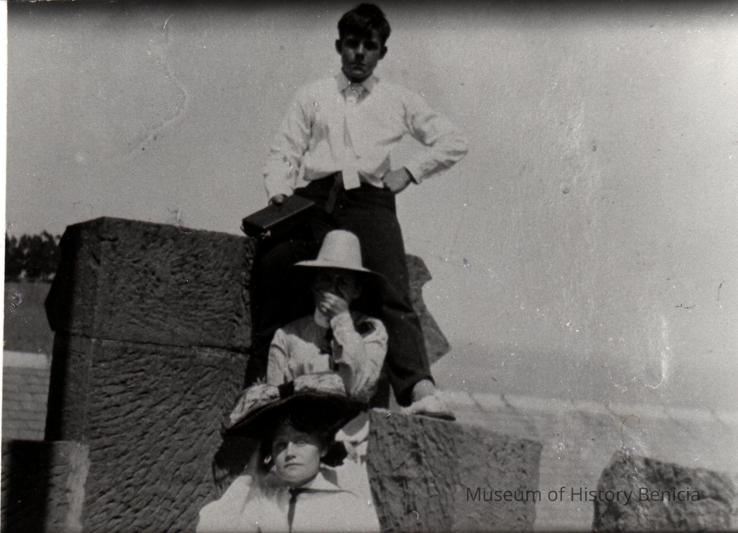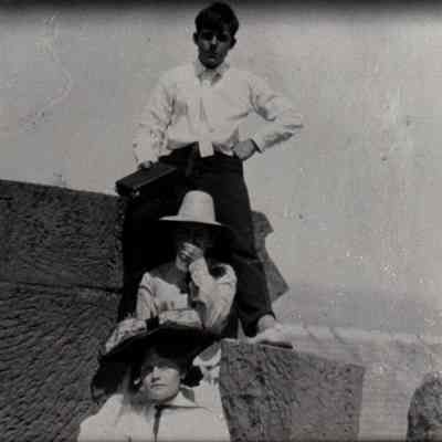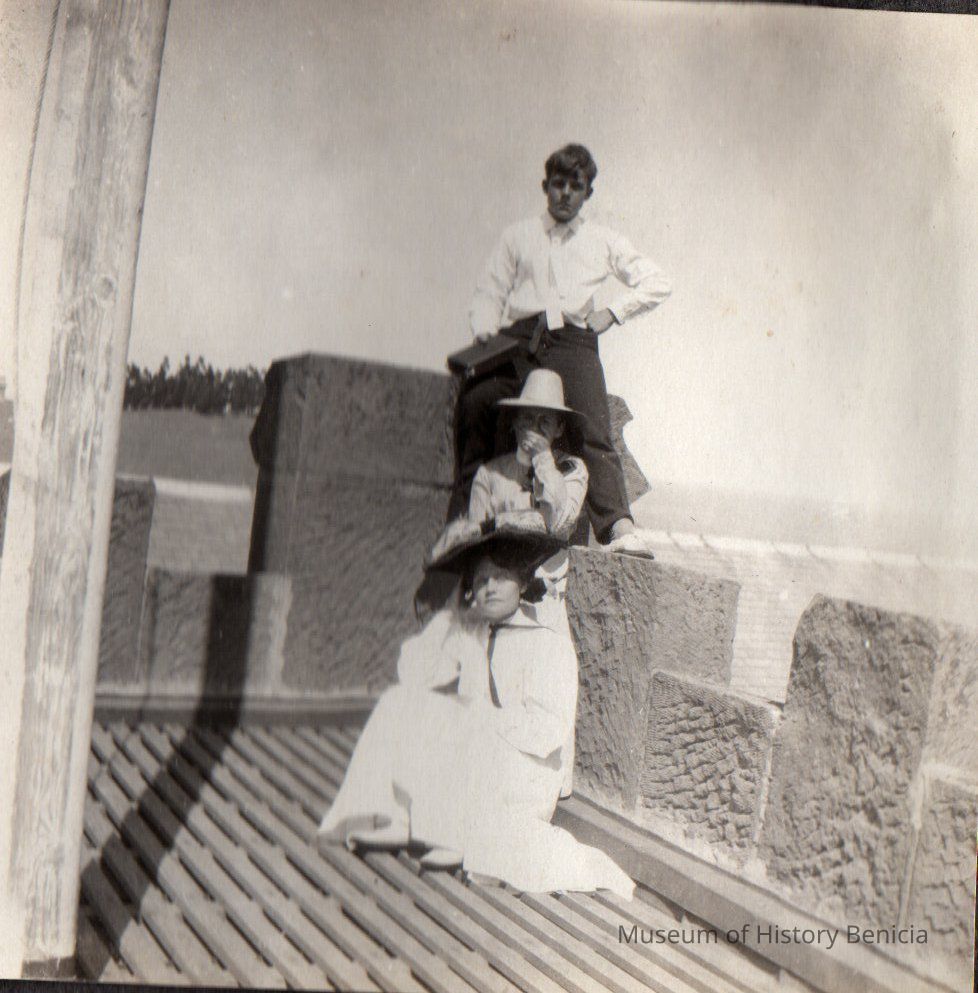B/W photograph in an album: Laura Benet, Valery ? and an unidentified woman on roof of Clock Tower.