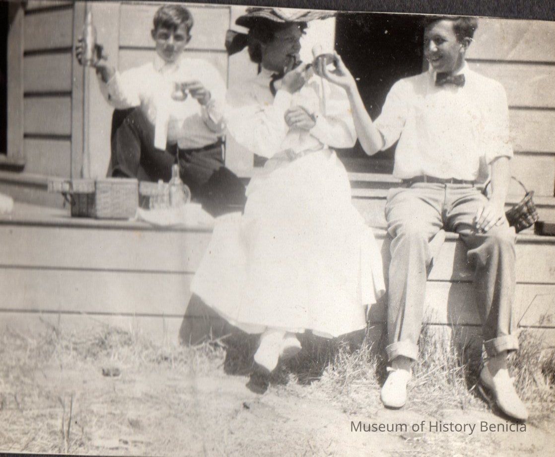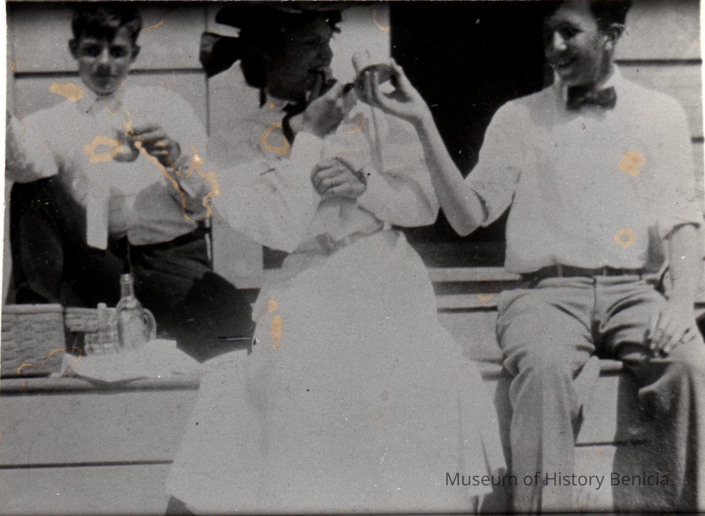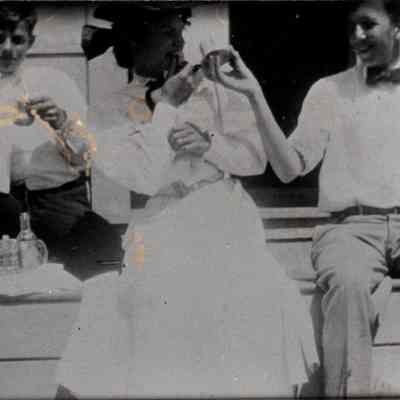 B/W photograph in an album: (L to R) Valery ? , an unidentified woman and William Rose Benet on porch of a building (most likely somehwhere on the arsenal grounds).Collection