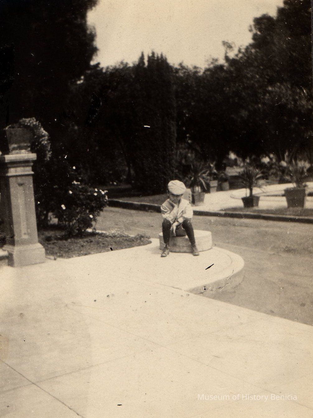 B/W photograph in an album showing Stephen V. Benet sitting on a block near the steps of the Commanding Officer's Quarters.