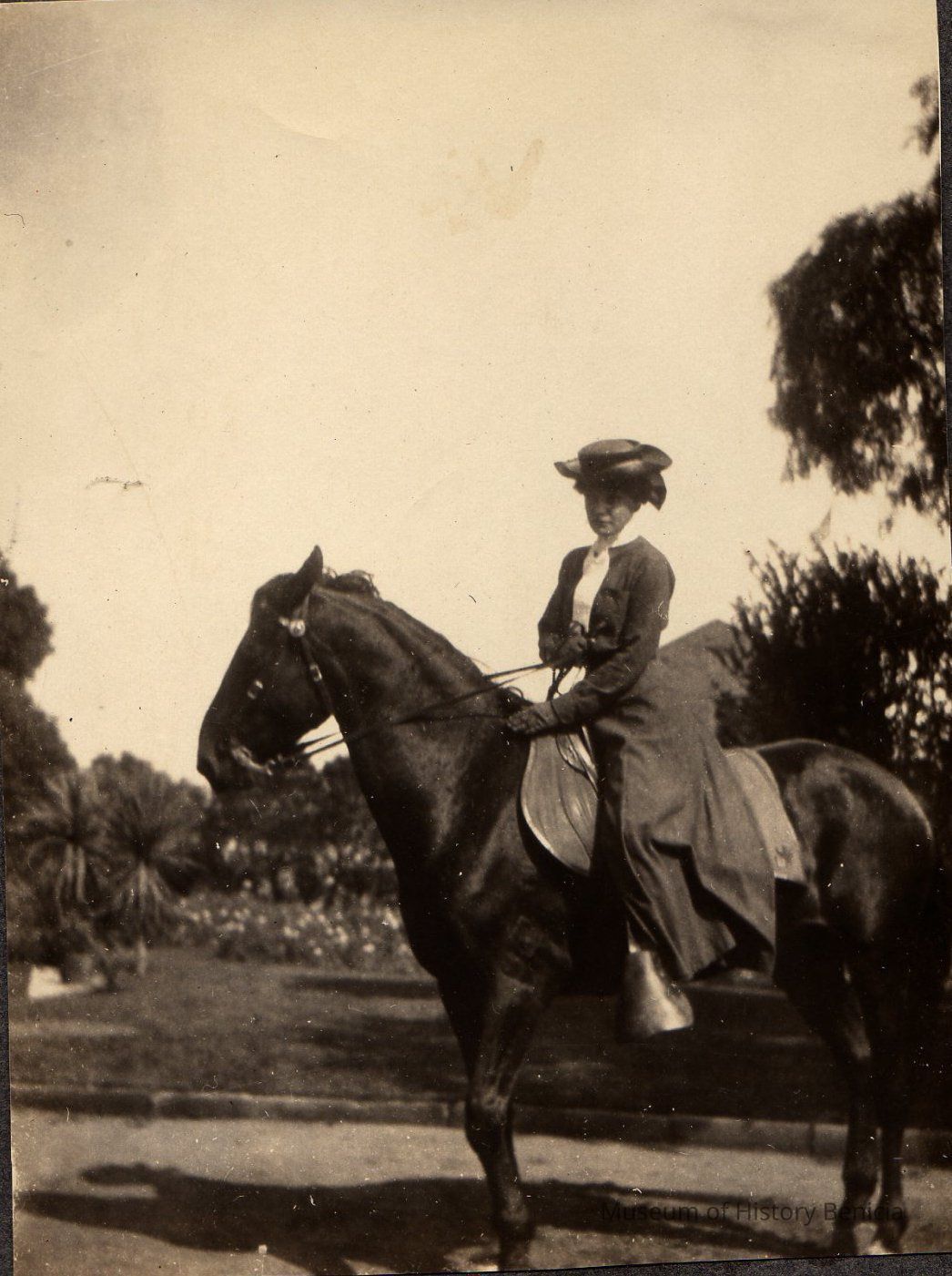 B/W photograph in an album: an unidentified woman on horseback with the Clock Tower behind.