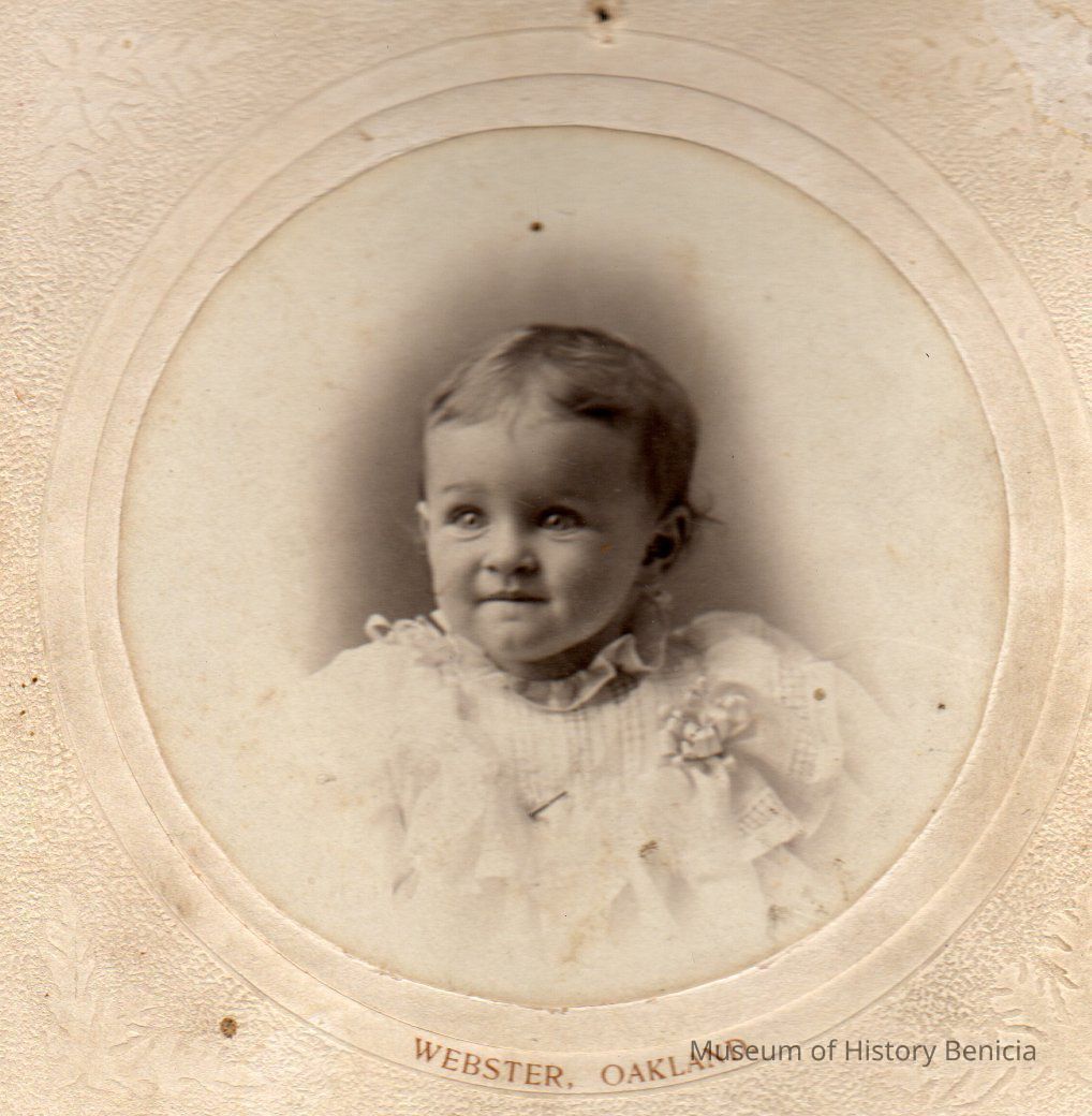 Round black and white bust view of baby in white clothes. "Webster, Oakland" bottom front. "Leslie Brown 1 yr 11 days old" written on back in ink.Collection