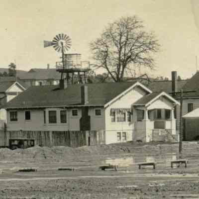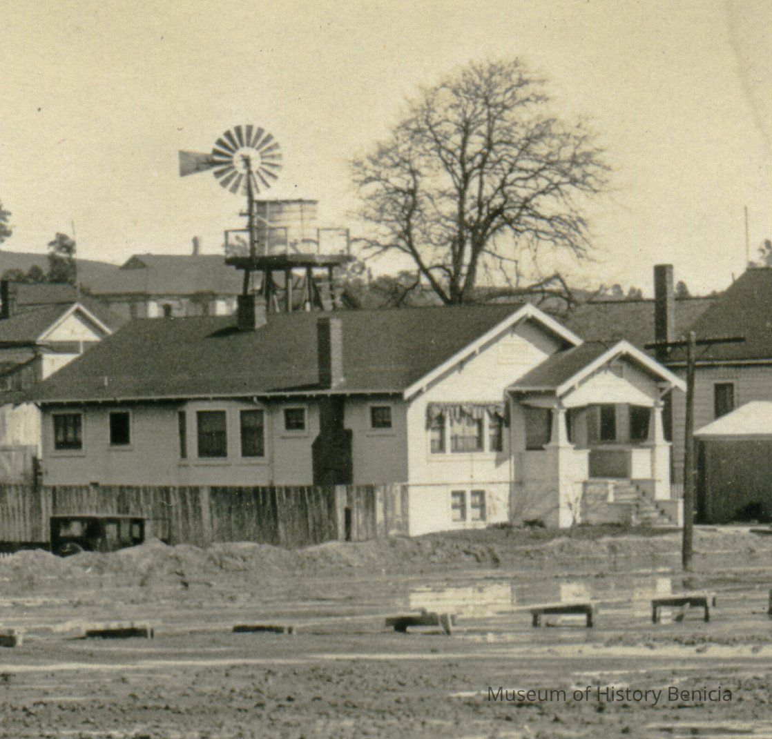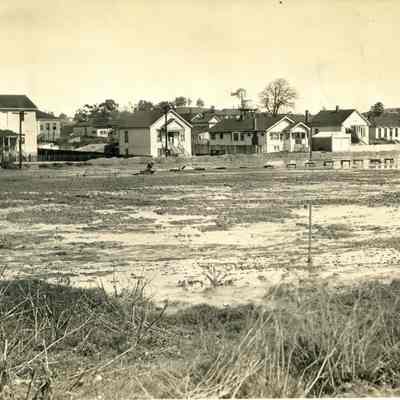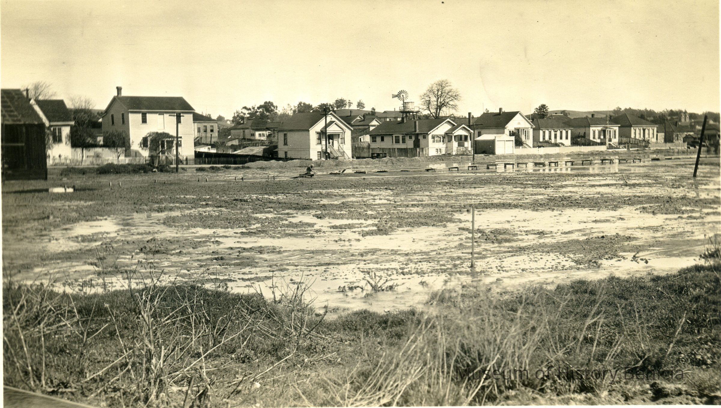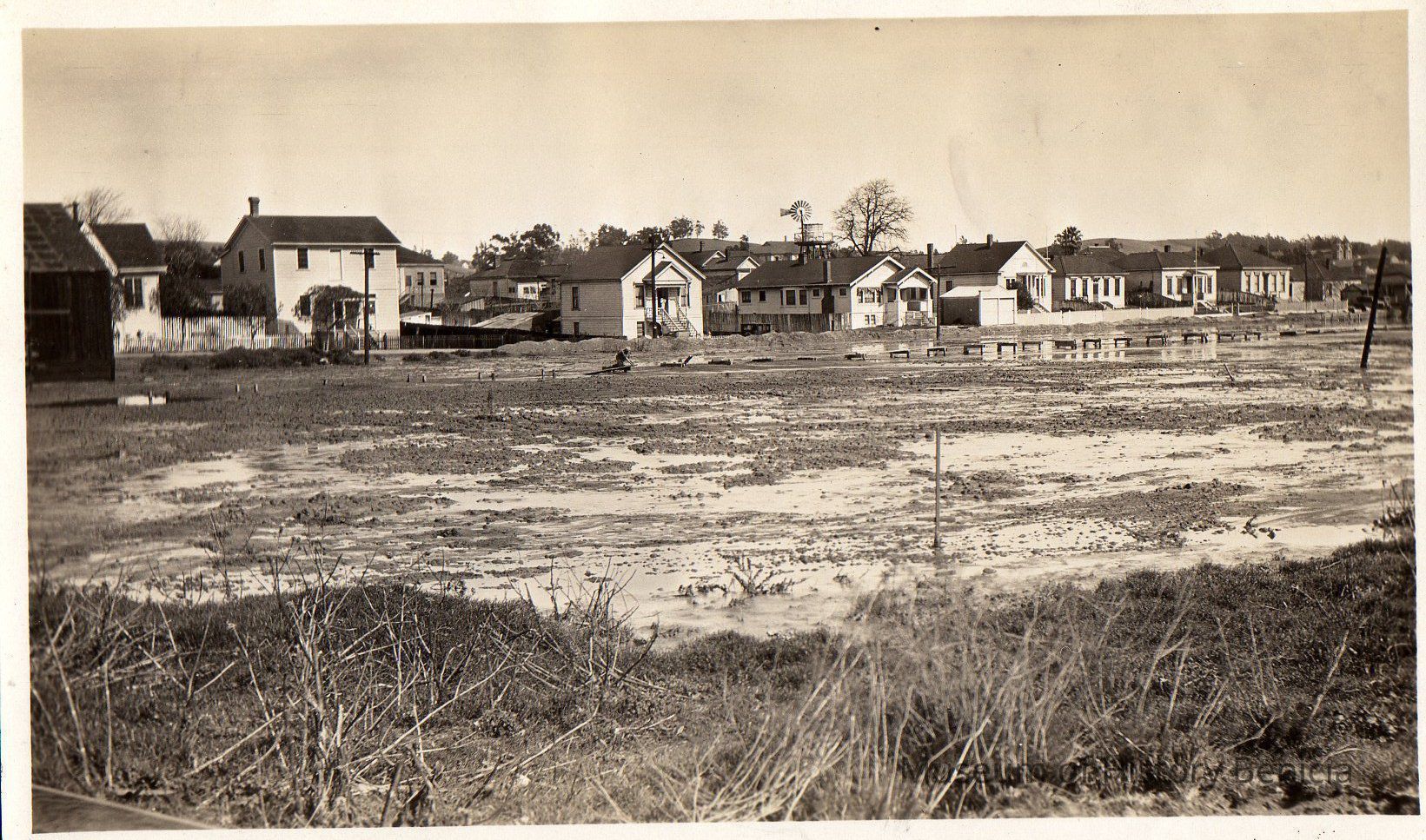 Marshy area in foreground, houses in background. On back: "Johnson ?" and "Reclamation 1929 of the tule area". Houses in background are on East F Street. Black and white photo.Collection