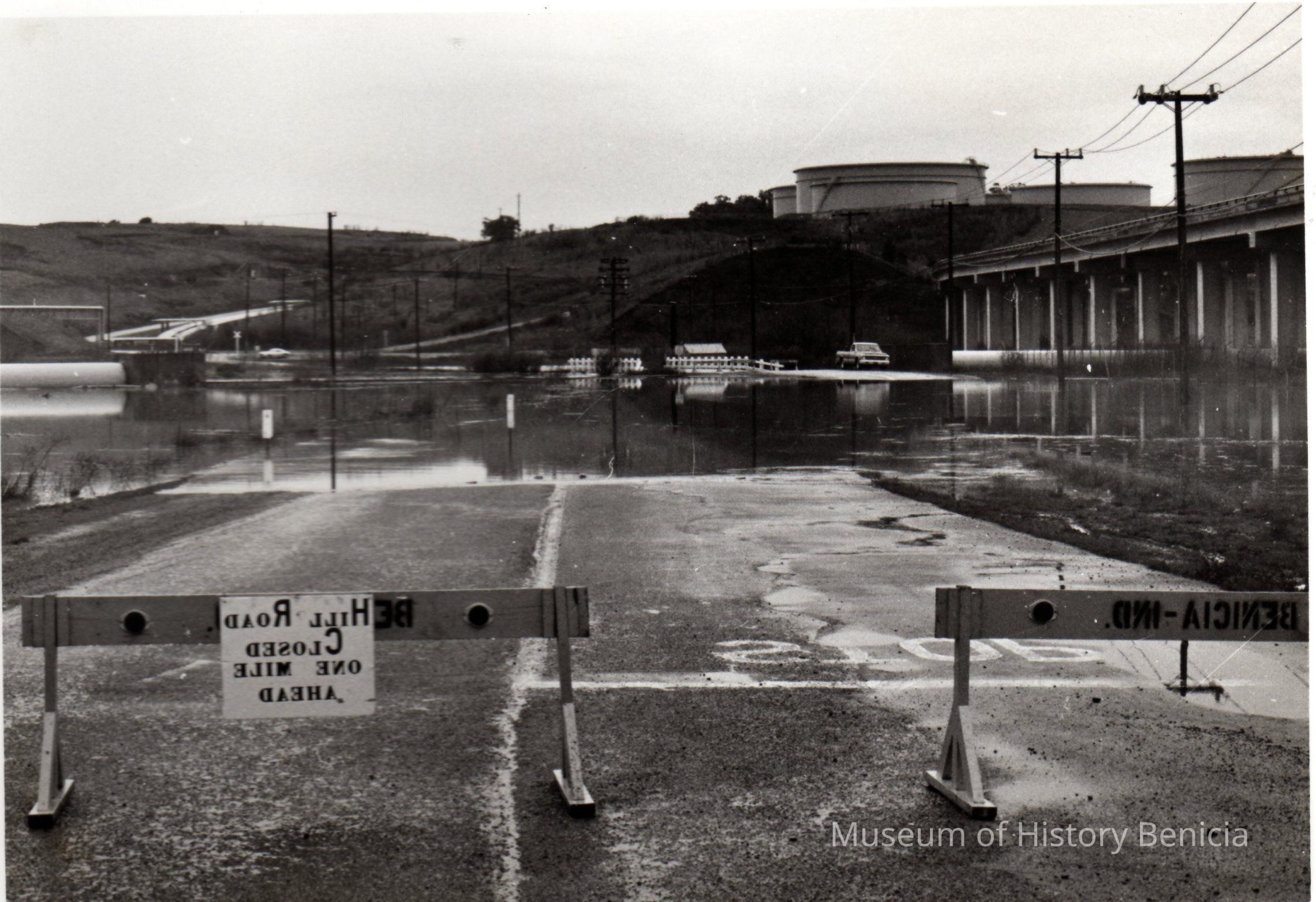 B/W photograph of Industrial Park flood. (This is a reverse print as the sign on the barrier reads backwards)