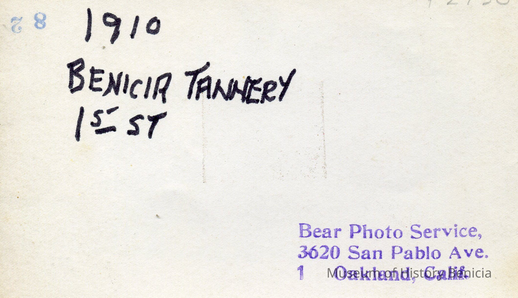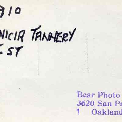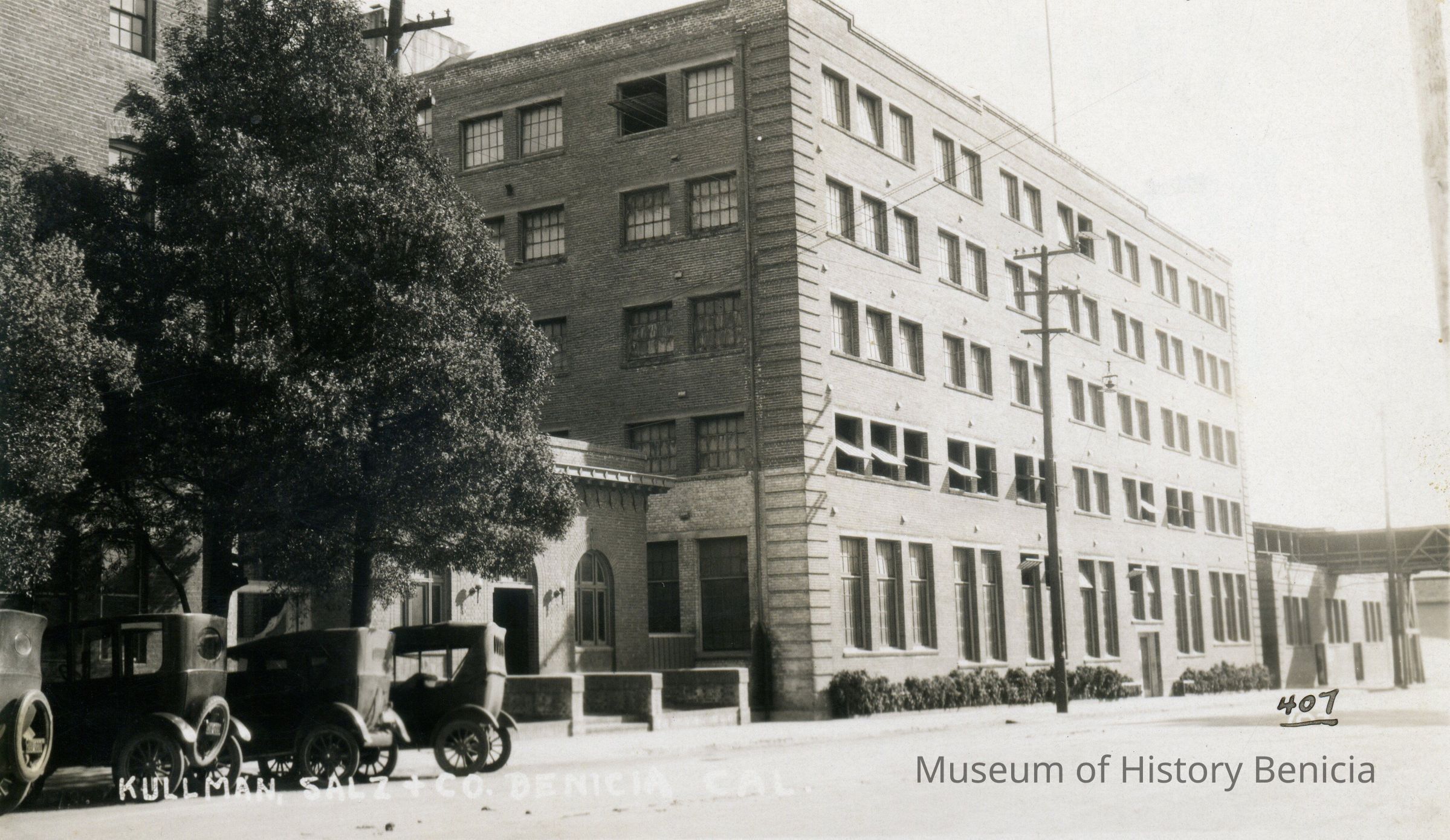 B/W snapshot of 5-story brick building with shorter buildings on either side. Connecting bridge at far right. "Kullman Salz & Co. Benicia Cal." at lower left; "407" in ink at right. "1910 Benicia Tannery 1st St." and "Bear Photo Service 3620 San Pablo, Oakland, Calif." stamped on back.Collection