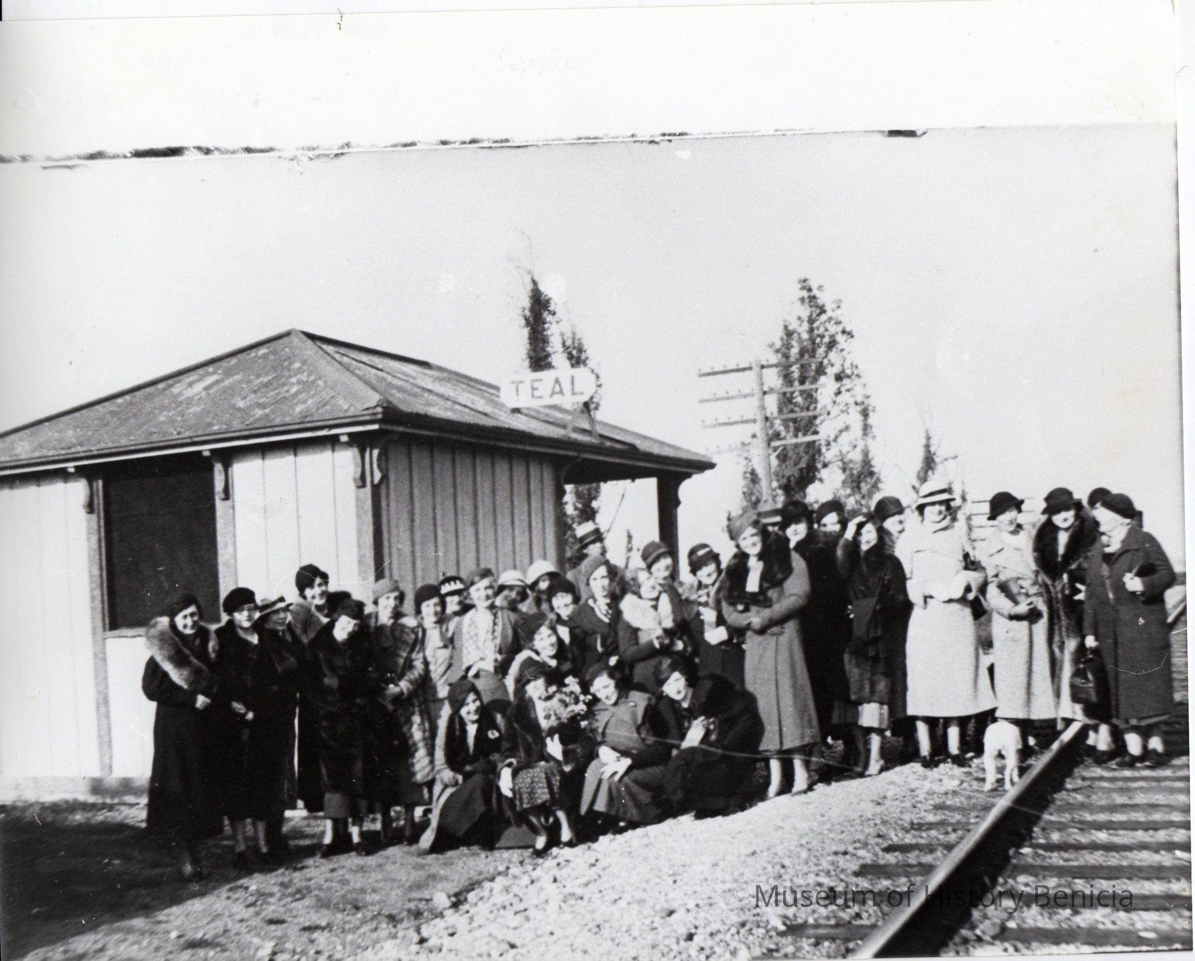 B/W photo of women employees come by train to outing at Teal Club in 1934. Teal Club is a duck club at the south end of Chadbourne Road in Suisun Marsh. Women were guests of club members.Collection