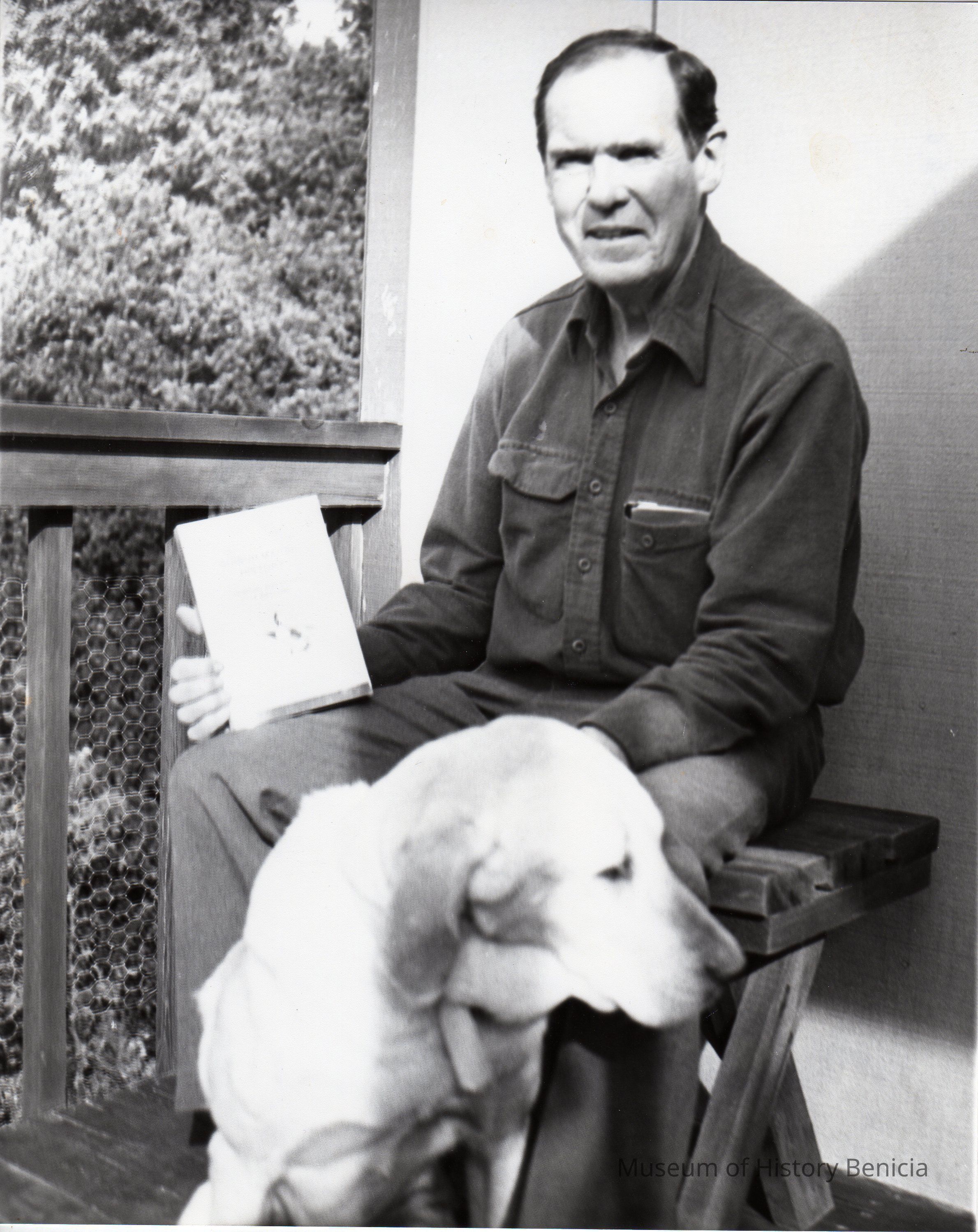 B/W photo of Tony Arnold with his book, "Suisun Marsh History." His dog "Center" was killed by a train near the Teal Club two days before Arnold was the speaker at the opening of the Museum exhibit "Wings and Wetlands.Collection