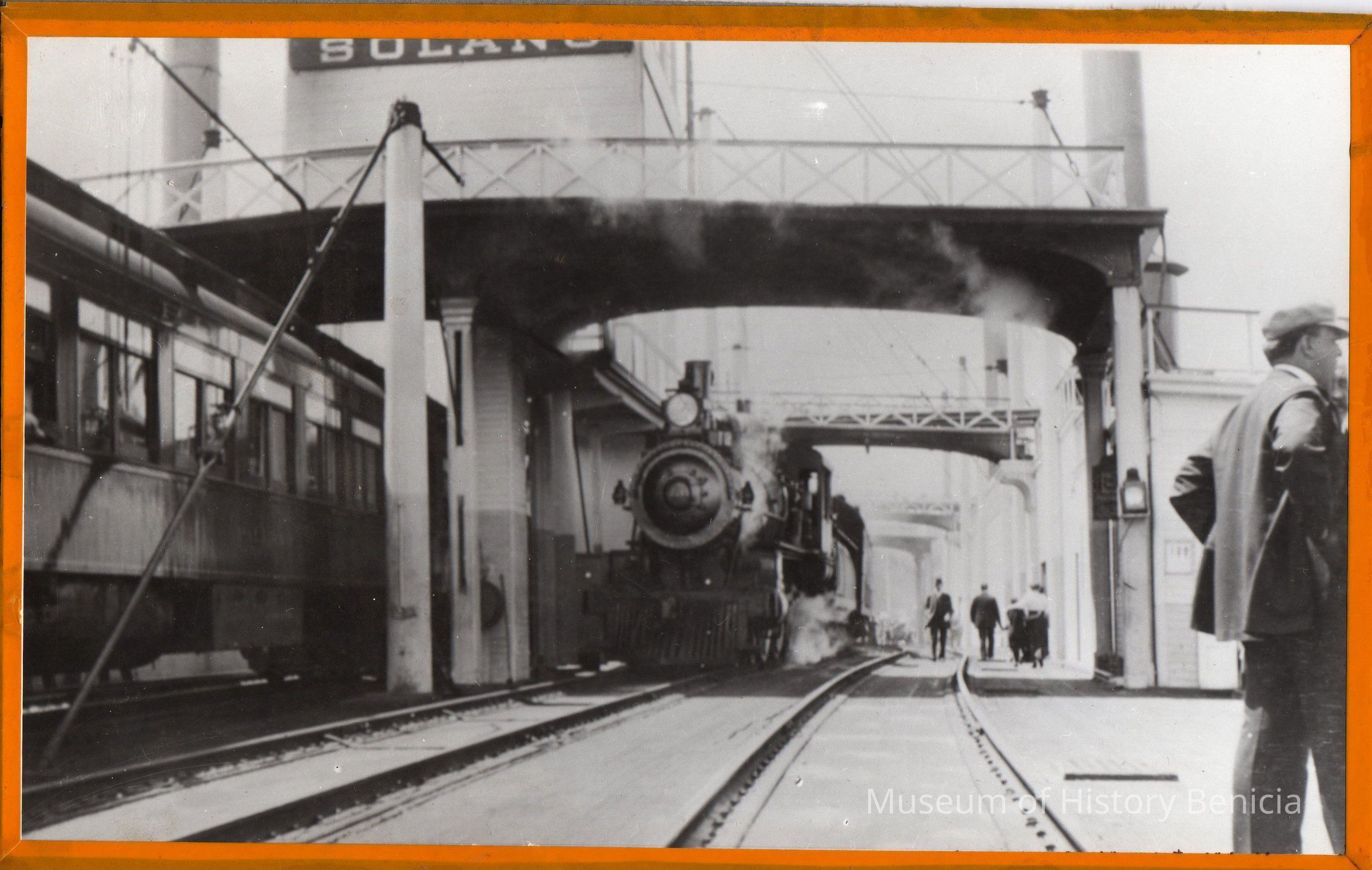 B/W photograph of a train being ferried aboard the "Solano".