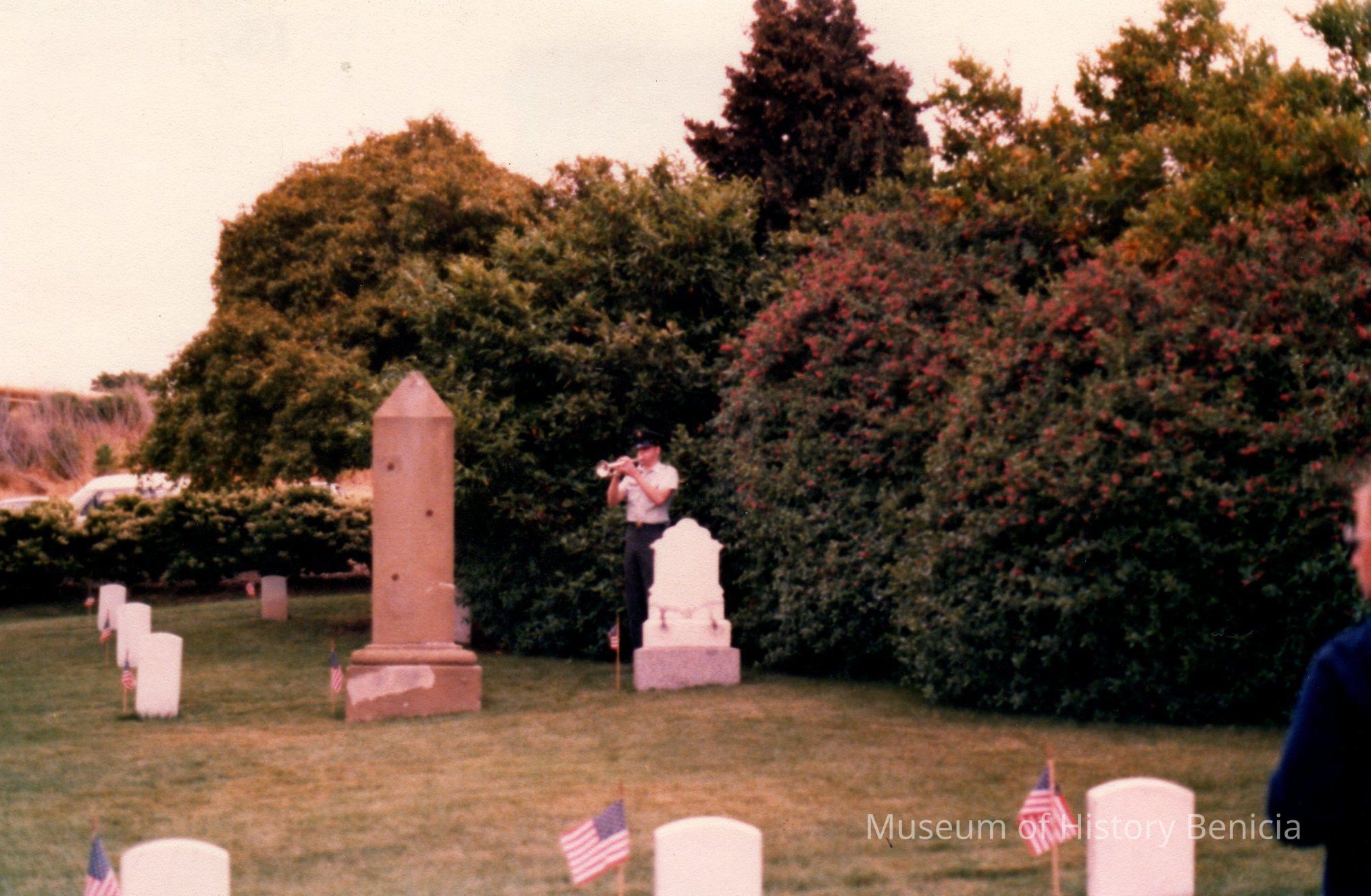 Color Photograph: Memorial Day services at the Benicia Military Cemetery, 1983. Photo shows soldier playing a bugle behind a tombstone.