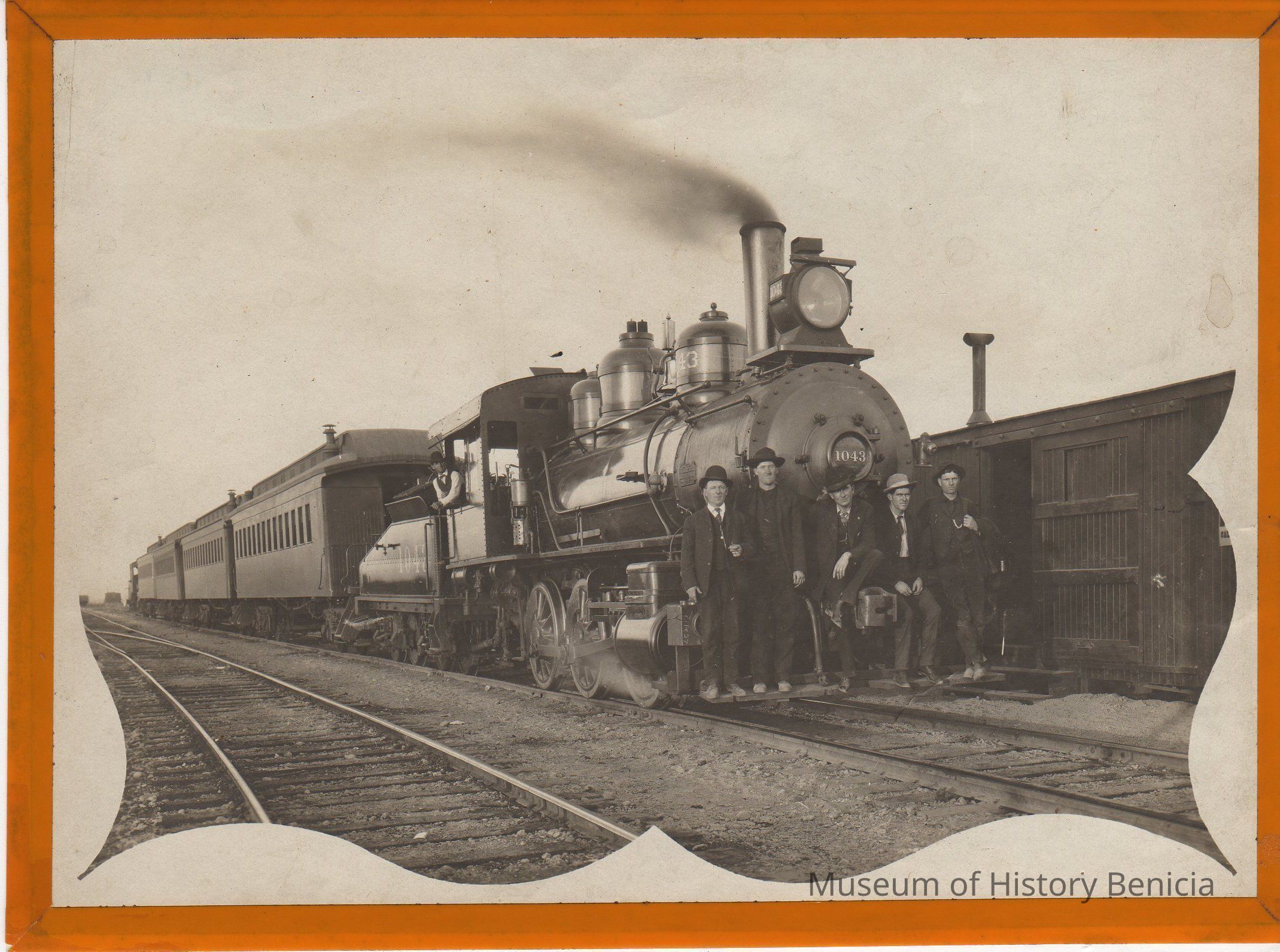 B/W Photograph: Southern Pacific engine 1043, five men standing on the front and one in the cab