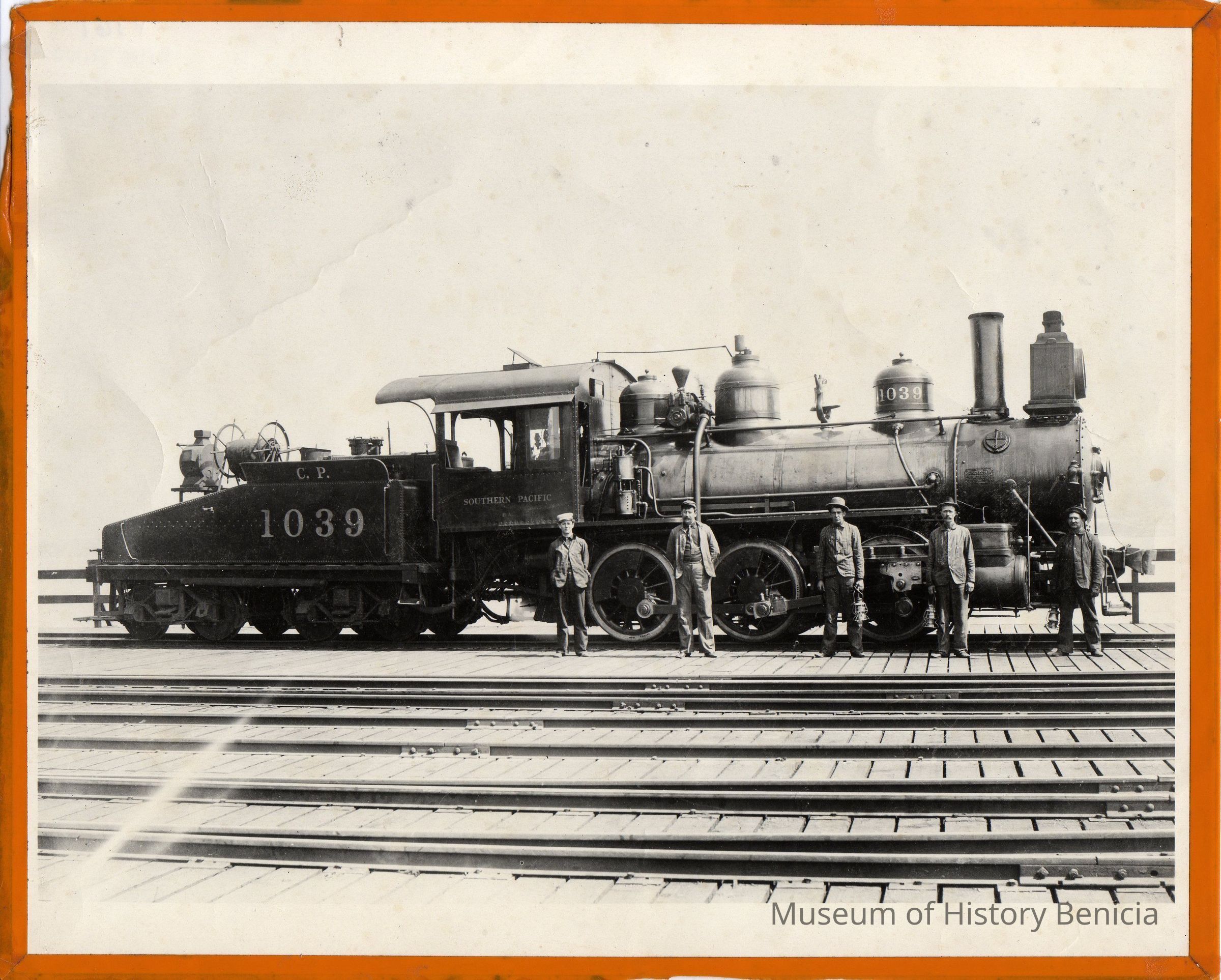 B/W Photograph: "Southern Pacific switch locomotive 1039 at Benicia in 1900: an early oil burner." (per label on reverse of the photograph)Collection