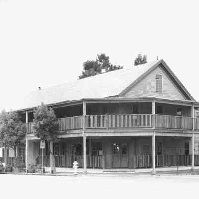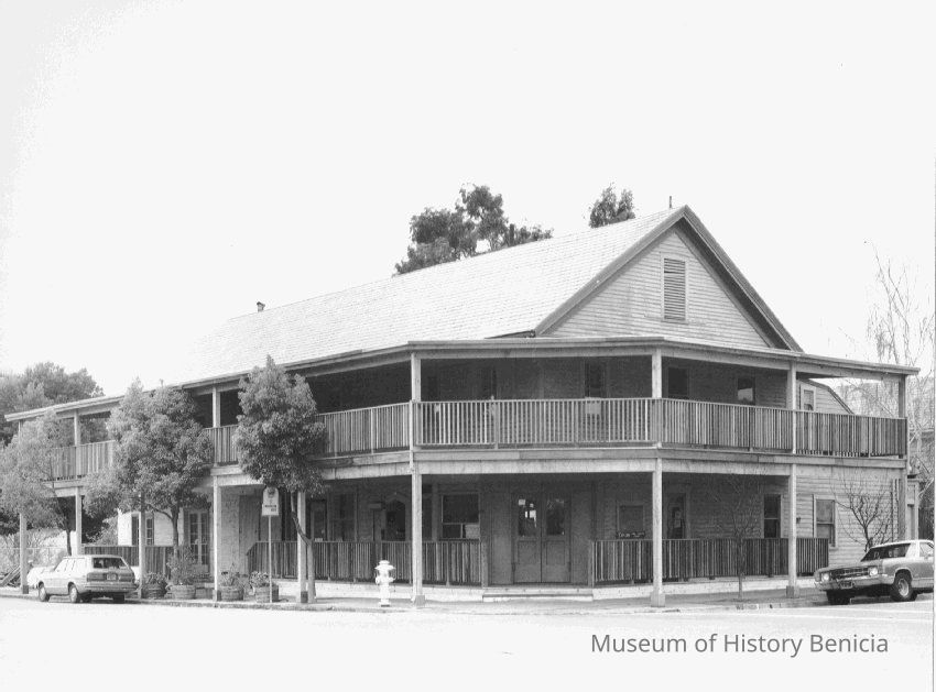 B/W Photograph originally under glass in a brown frame with gold trim. The photograph is glued to a mat board. It is of a wood-framed building with two stories on a corner lot with second-floor railed porch. The caption reads: "Washington House was erected in 1850 and housed some members of the state legislature during this period when Benicia served as the state's third capital. In its colorful history it has served as a hotel, a Chinese lottery, a speakeasy, a bordello, an artist's studio, and now as an antique shop and restaurant. " In 2014 it is being used mainly by Kinder's Meats/Deli and other small shops.Collection