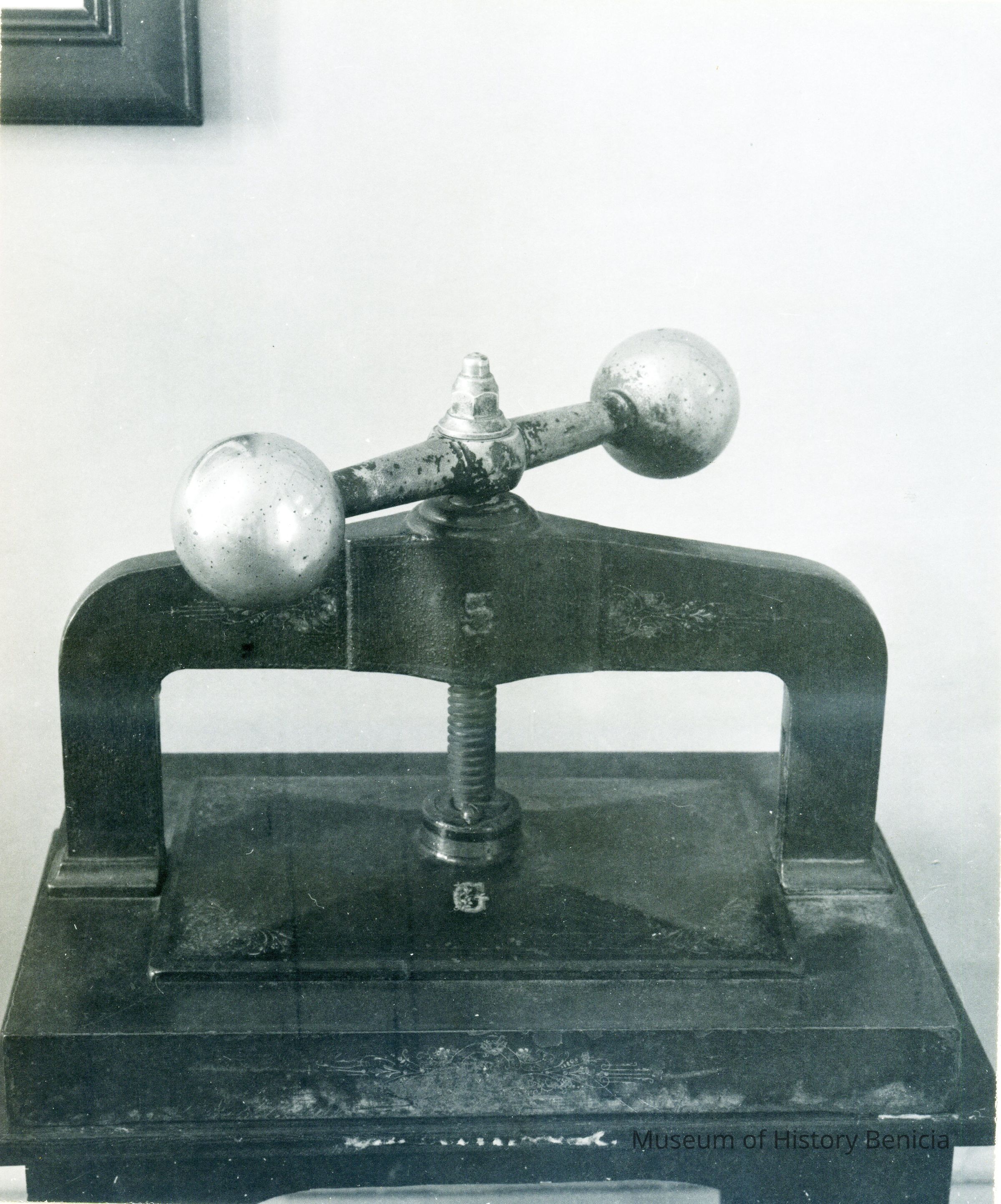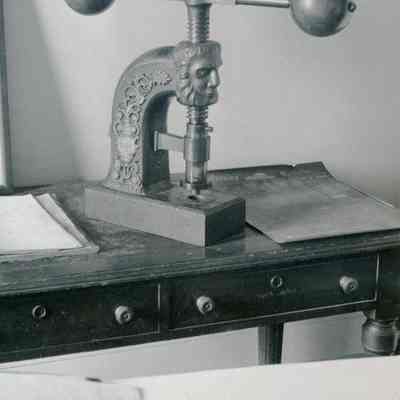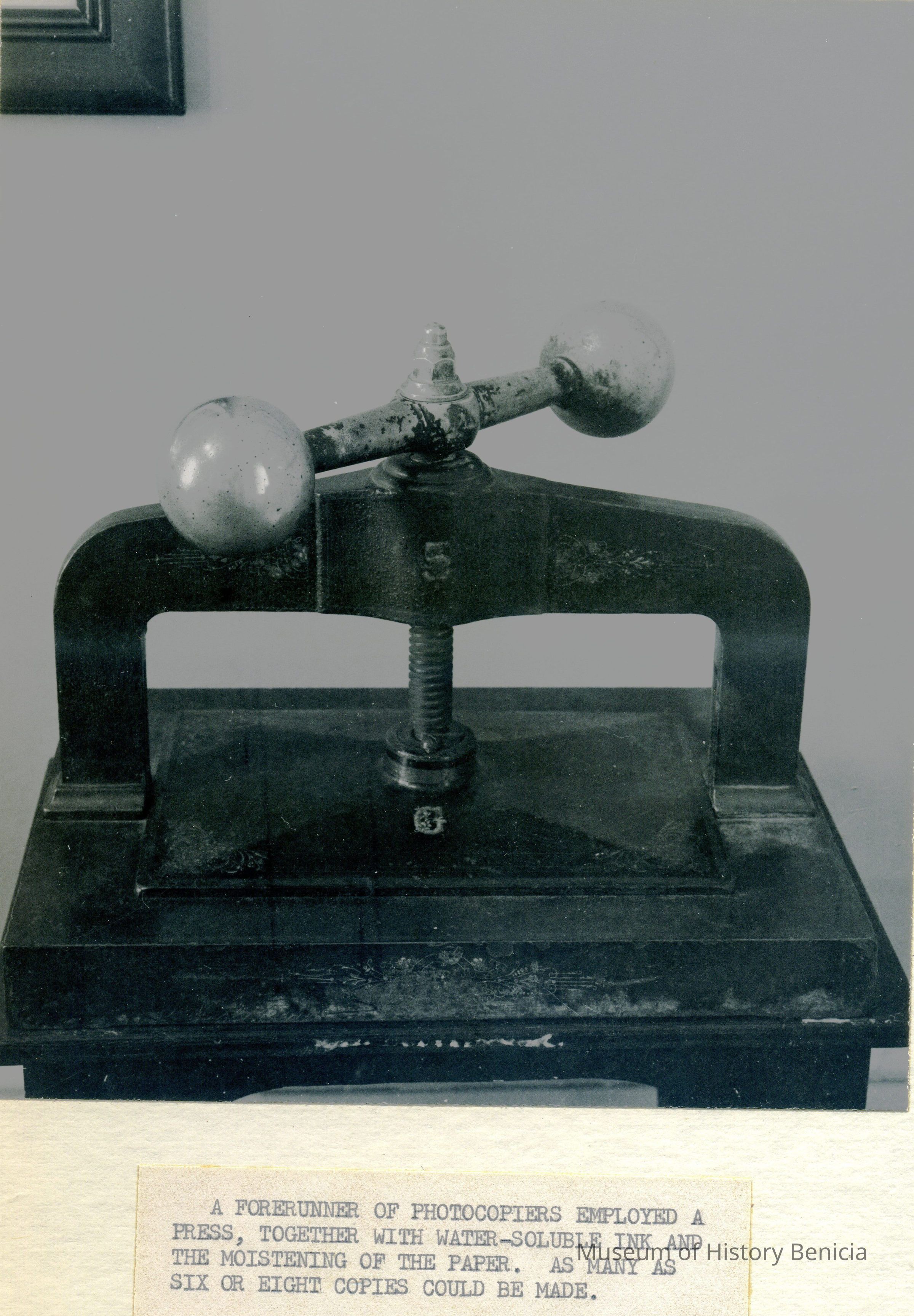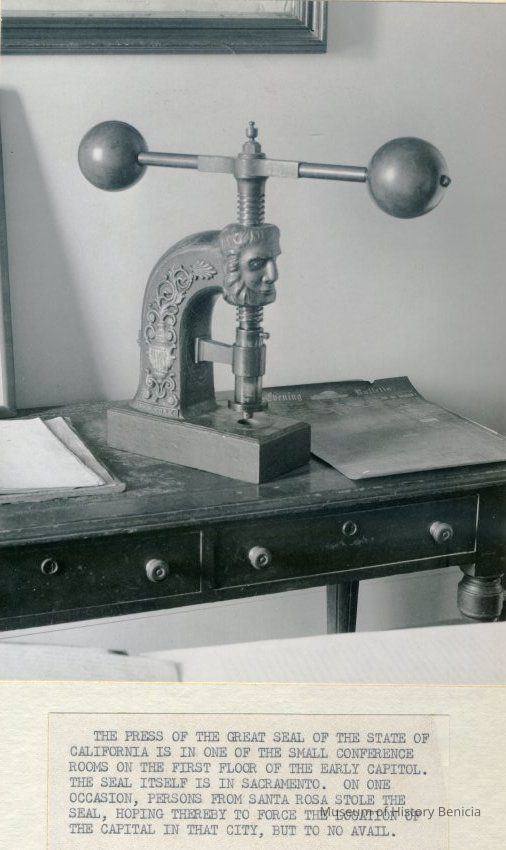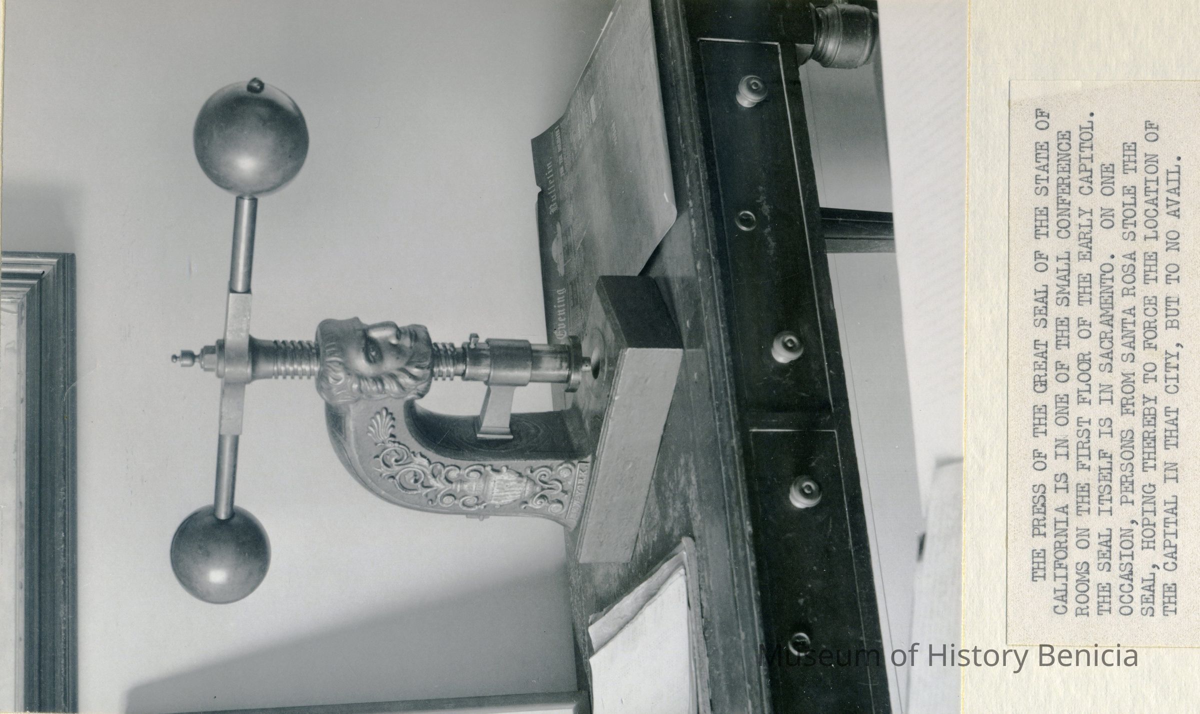 Two B/W photographs originally under glass in a black wood frame with a gold inner edge. The photographs are glued to a mat board. Photo on the left shows an ornate seal press on a table with two drawers and papers to the right and left of press. Beneath the photo: "The press of the Great Seal of the State of California is in one of the small conference rooms on the first floor of the Early Capitol. The seal itself is in Sacramento. On one occasion, persons from Santa Rosa stole the Seal, hoping thereby to force the loction of the capital in that city, but to no avail." Photo on the right is described: "A forerunner of photocopiers employed a press, together with water-soluble ink and the moistening of the paper. As many as six or eight copies could be made."Collection