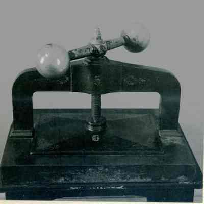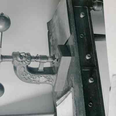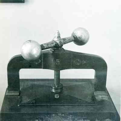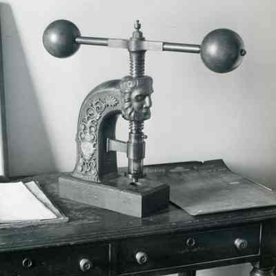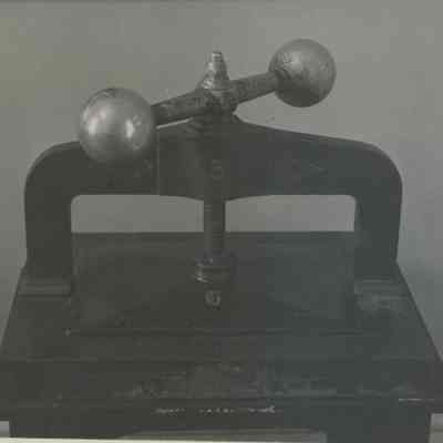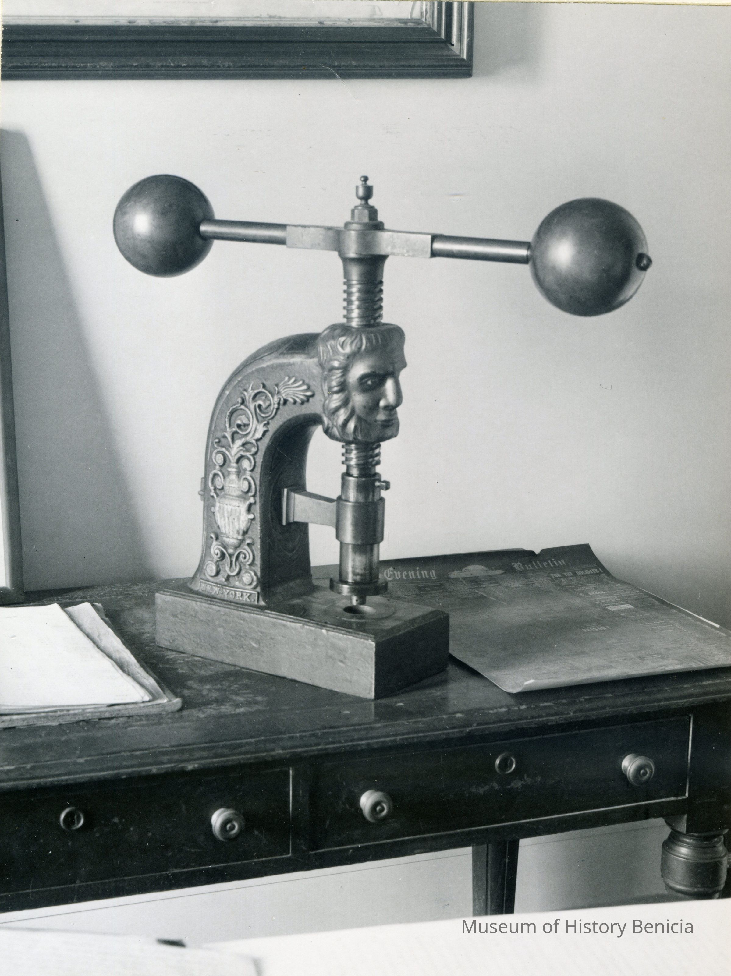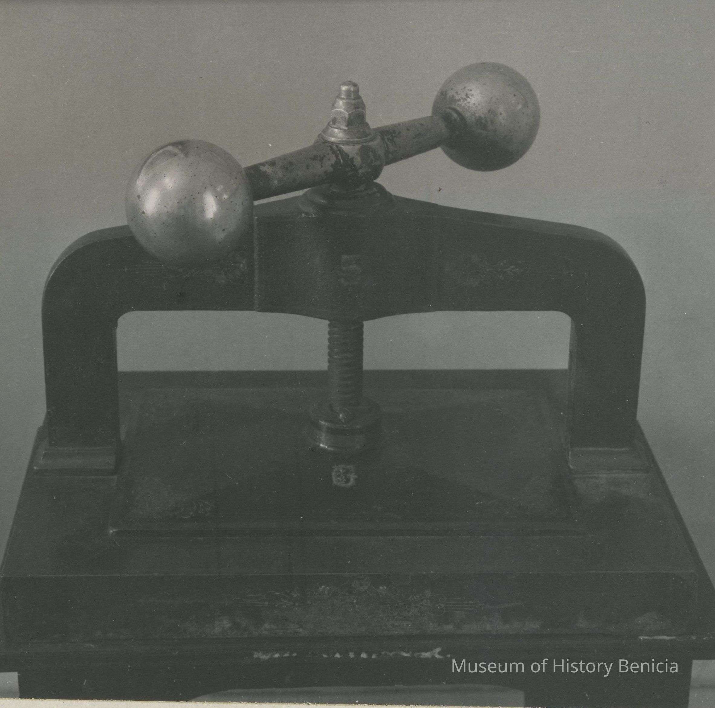 Two B/W photographs originally under glass in a black wood frame with a gold inner edge. The photographs are glued to a mat board. Photo on the left shows an ornate seal press on a table with two drawers and papers to the right and left of press. Beneath the photo: "The press of the Great Seal of the State of California is in one of the small conference rooms on the first floor of the Early Capitol. The seal itself is in Sacramento. On one occasion, persons from Santa Rosa stole the Seal, hoping thereby to force the loction of the capital in that city, but to no avail." Photo on the right is described: "A forerunner of photocopiers employed a press, together with water-soluble ink and the moistening of the paper. As many as six or eight copies could be made."Collection