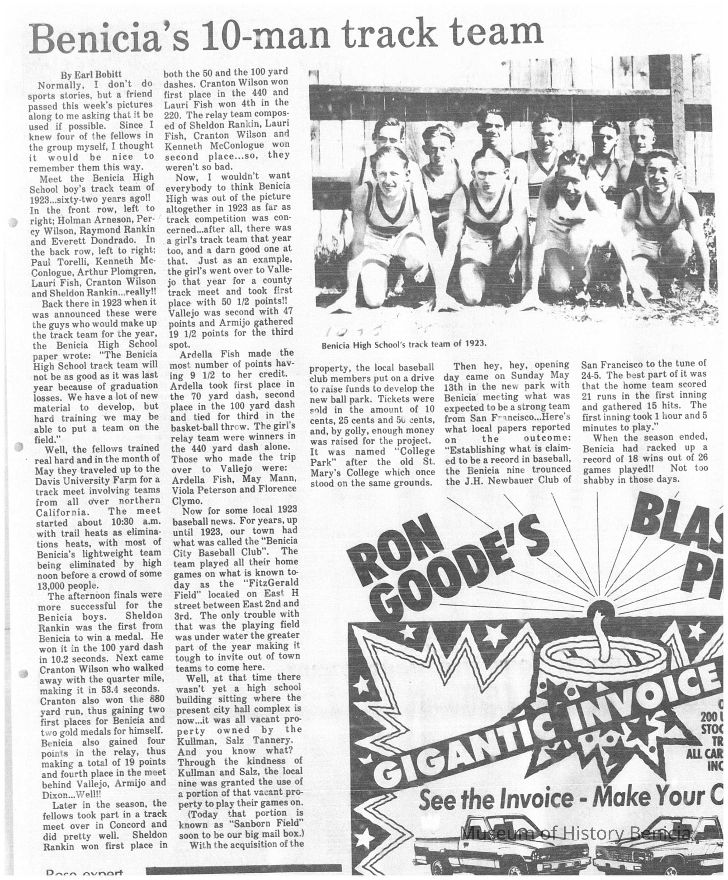 Attached is a newspaper article from the Benicia Hearld of 07/07/1985showing the same photo and discussing the Benicia track team.Collection