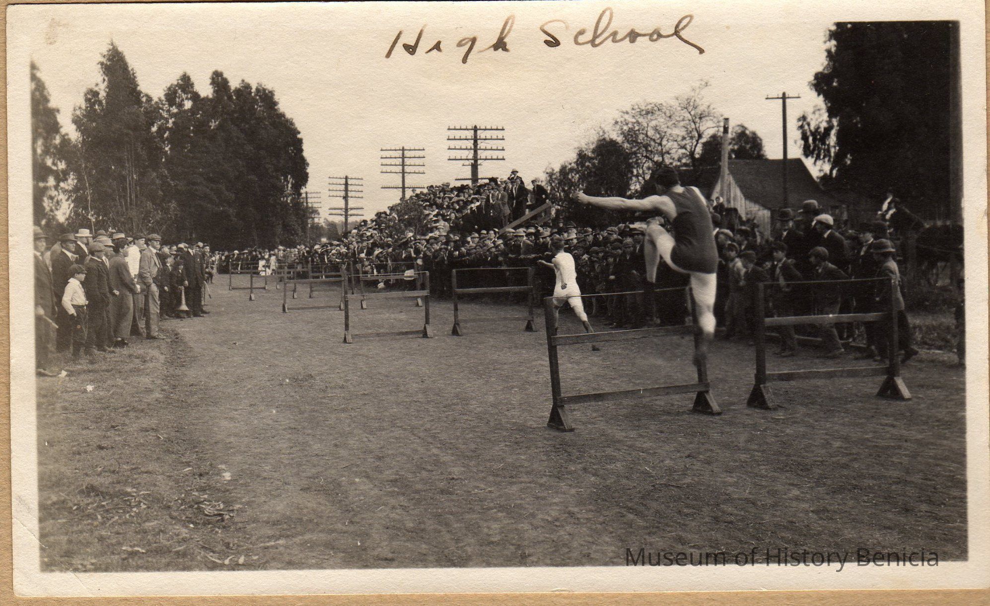 B/W Photograph: Benicia High School holding high hurdle meet on M Street Benicia park. Date of event unknown.