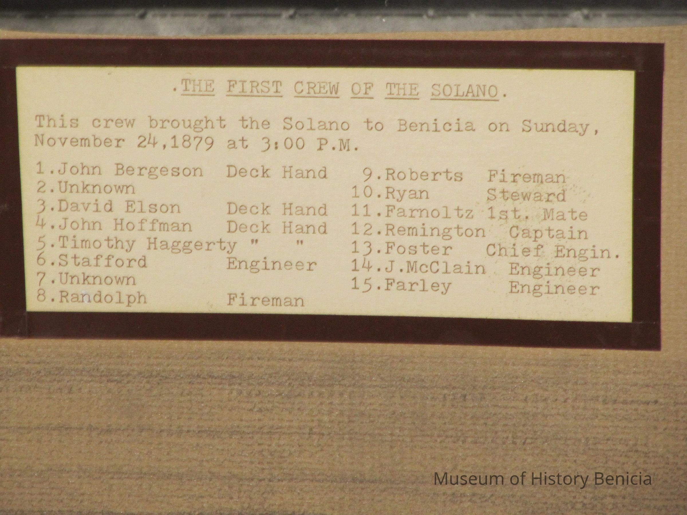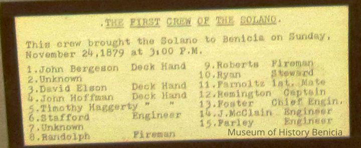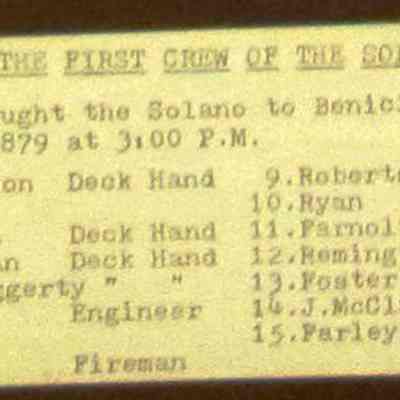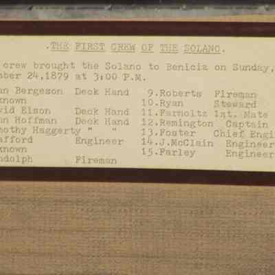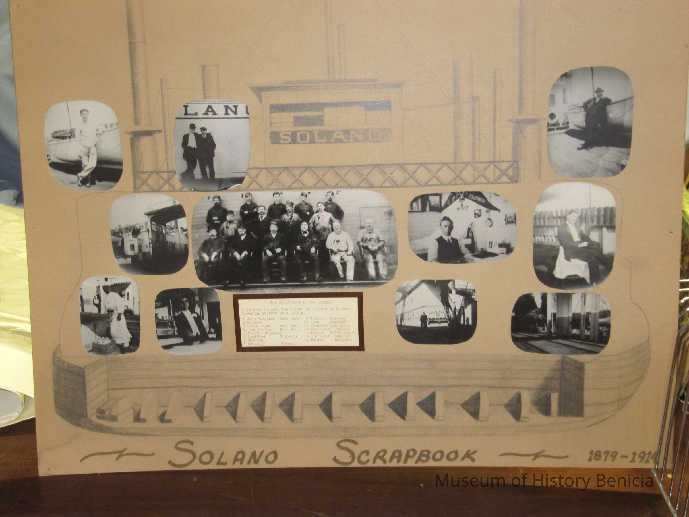 B/W collage of the first crew of the "Solano". This crew brought the "Solano" to Benicia on Sunday, November 24, 1879 at 3:00 pm. 15 people shown, list on photo accession sheet.Collection