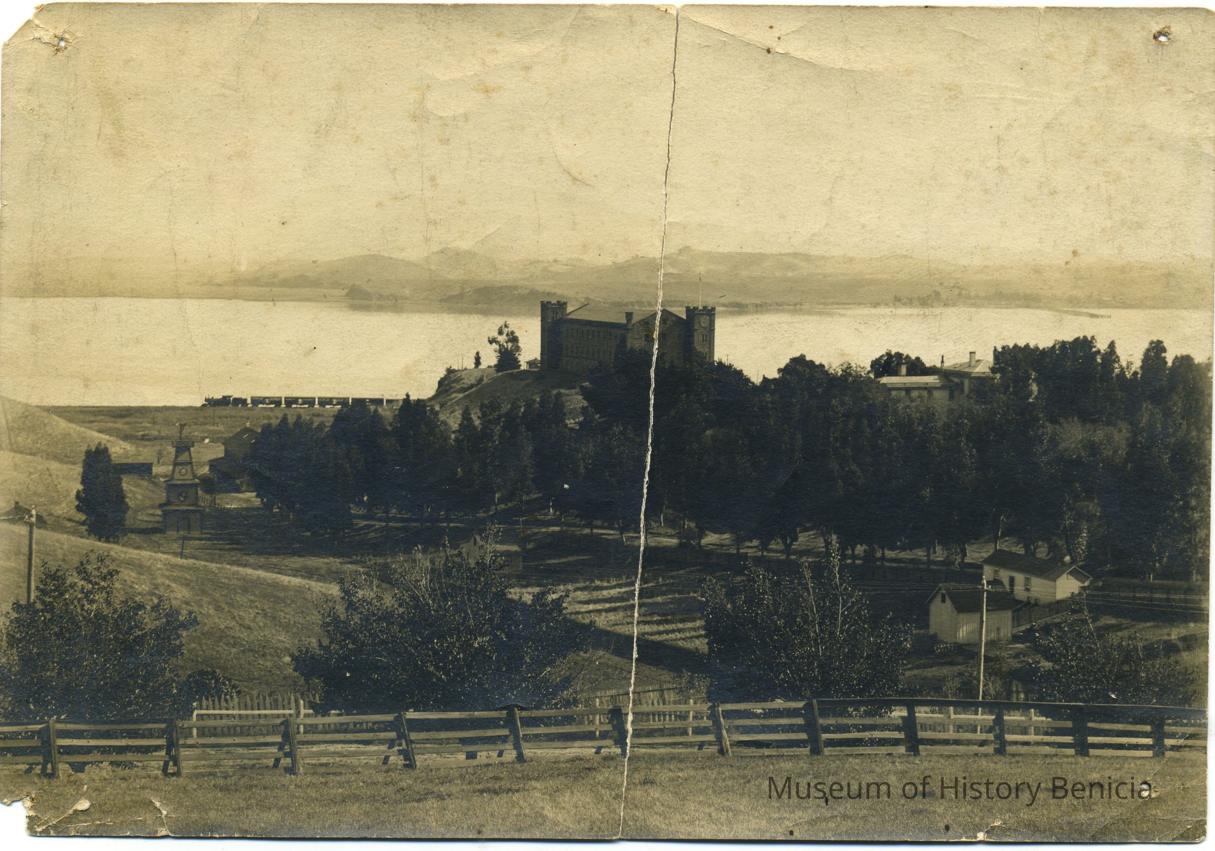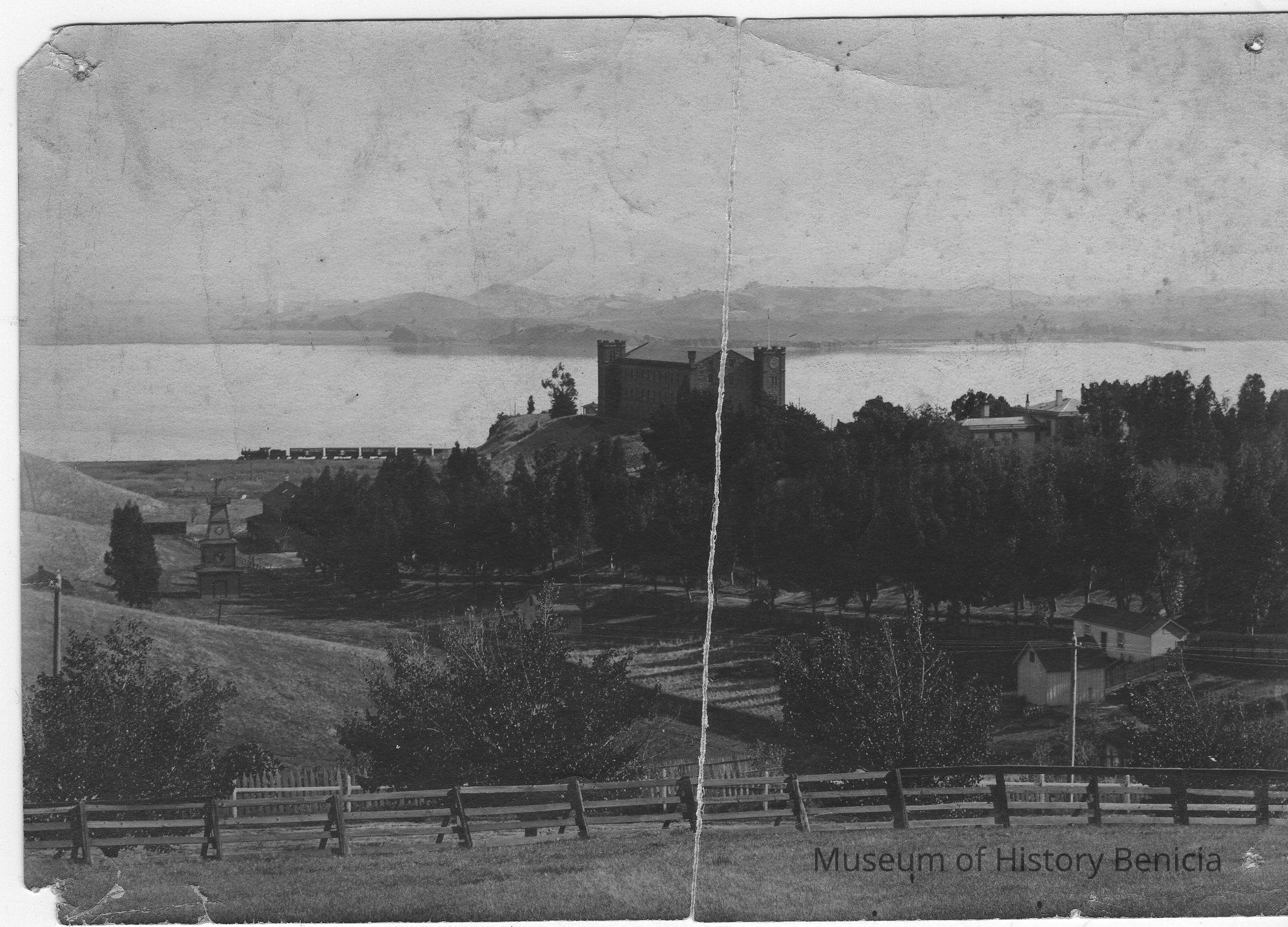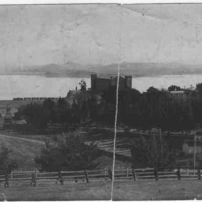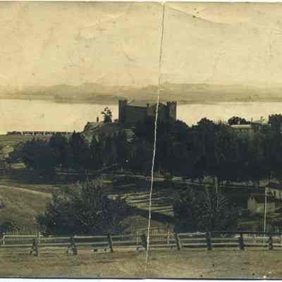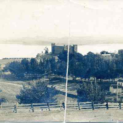 B/W photo of the arsenal, the Clock Tower, and the Commandant's Home.