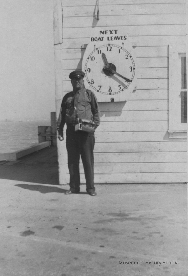 Ticket man standing in front of Martinez-Benicia ferry waiting room. Clock on wall tells when next boat leaves.