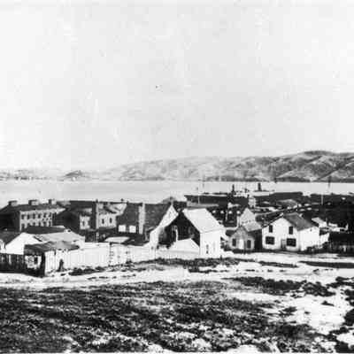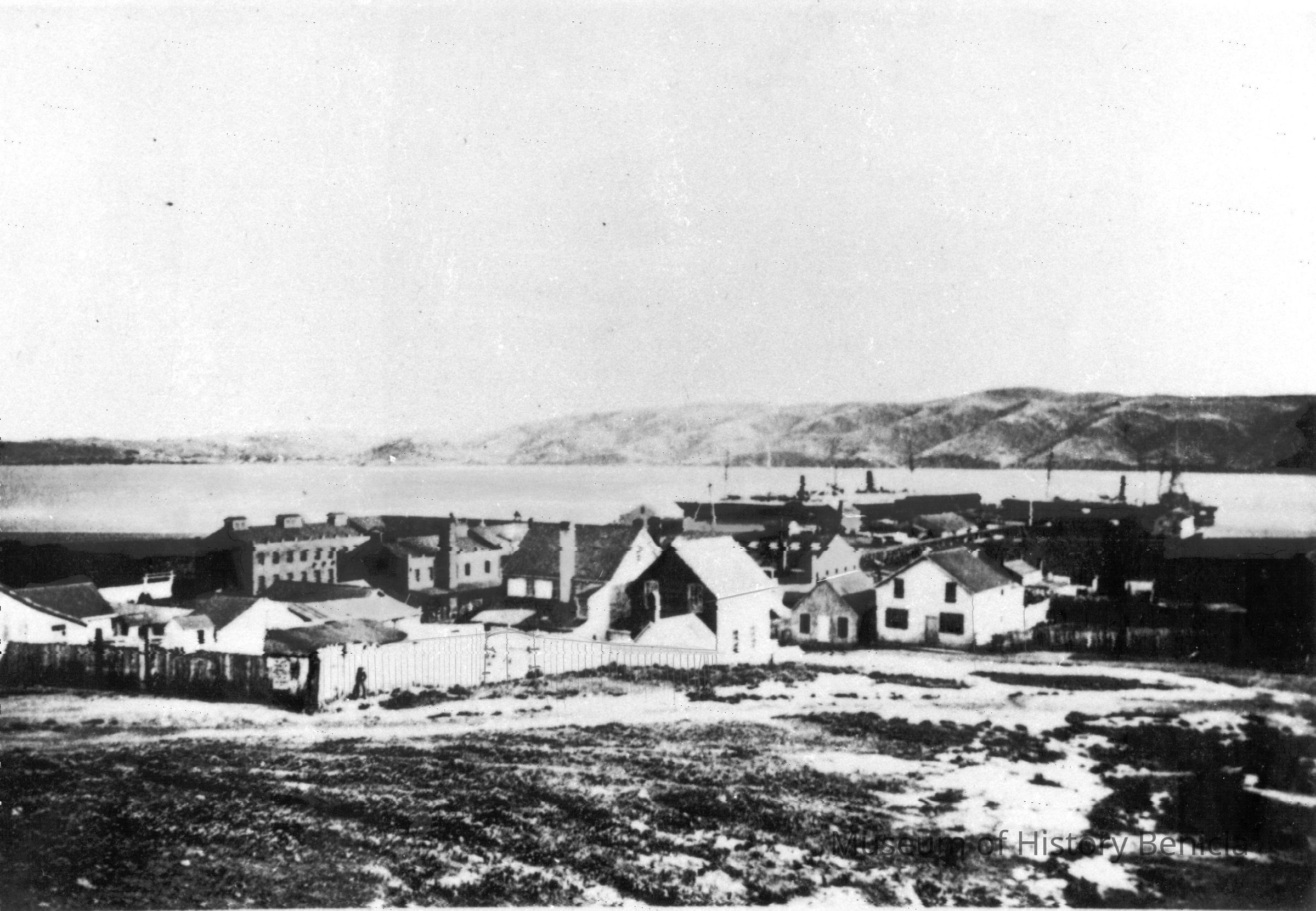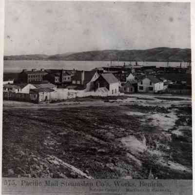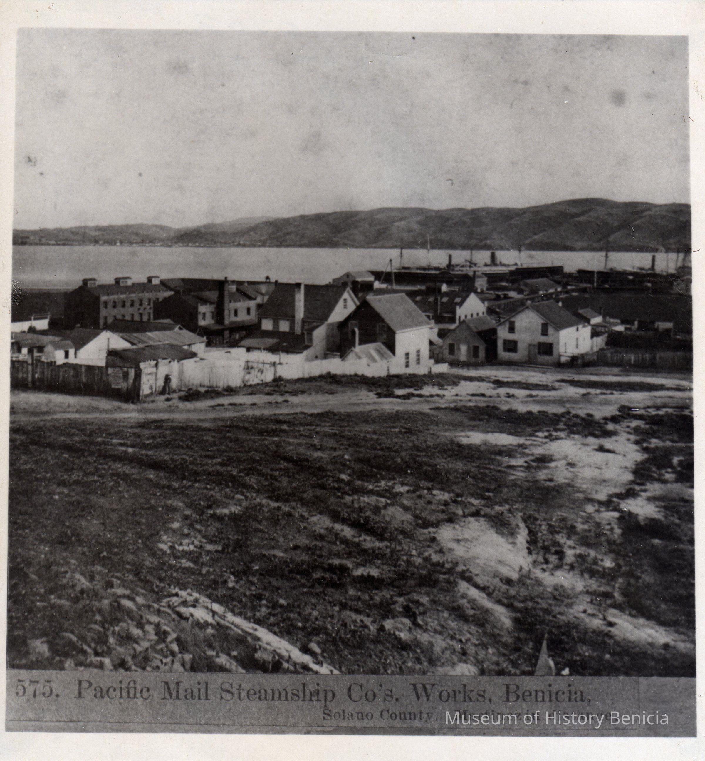 Photo of Pacific Mail Steamship Co. buildings, Benicia, with Martinez across the straits.