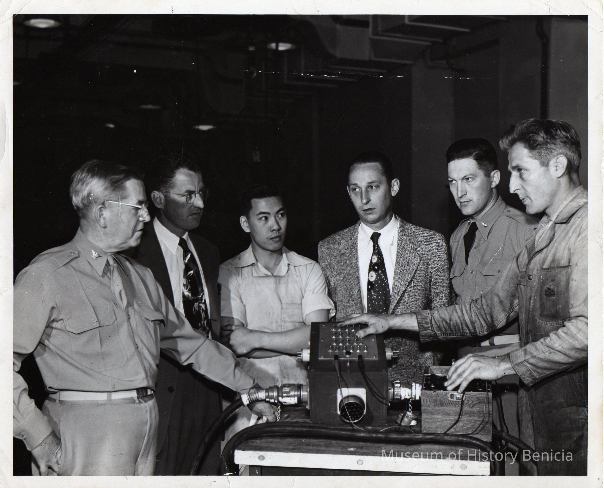 L/R: Col. Lewis A. Nickerson, C.O.; Ed Koenig; Edward K. Jee; Lowell Kunze; Maj. Clarence Hart; Henry Perry. B/W photo.