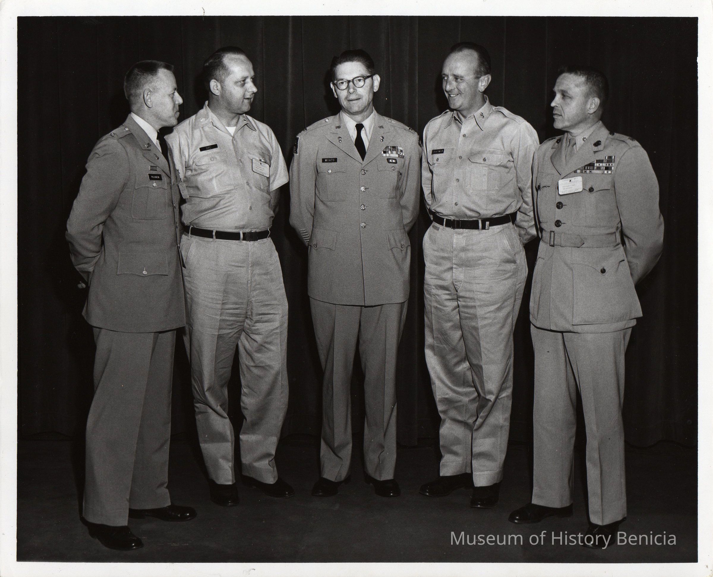 Col. Wilton Briggs Moats, center. Lt. Col. Art Chapman, Dir. Supply. Oper. on his left. Visiting Marine Corps officer on right. Larson on left, Bird next to him. B/W photo.Collection