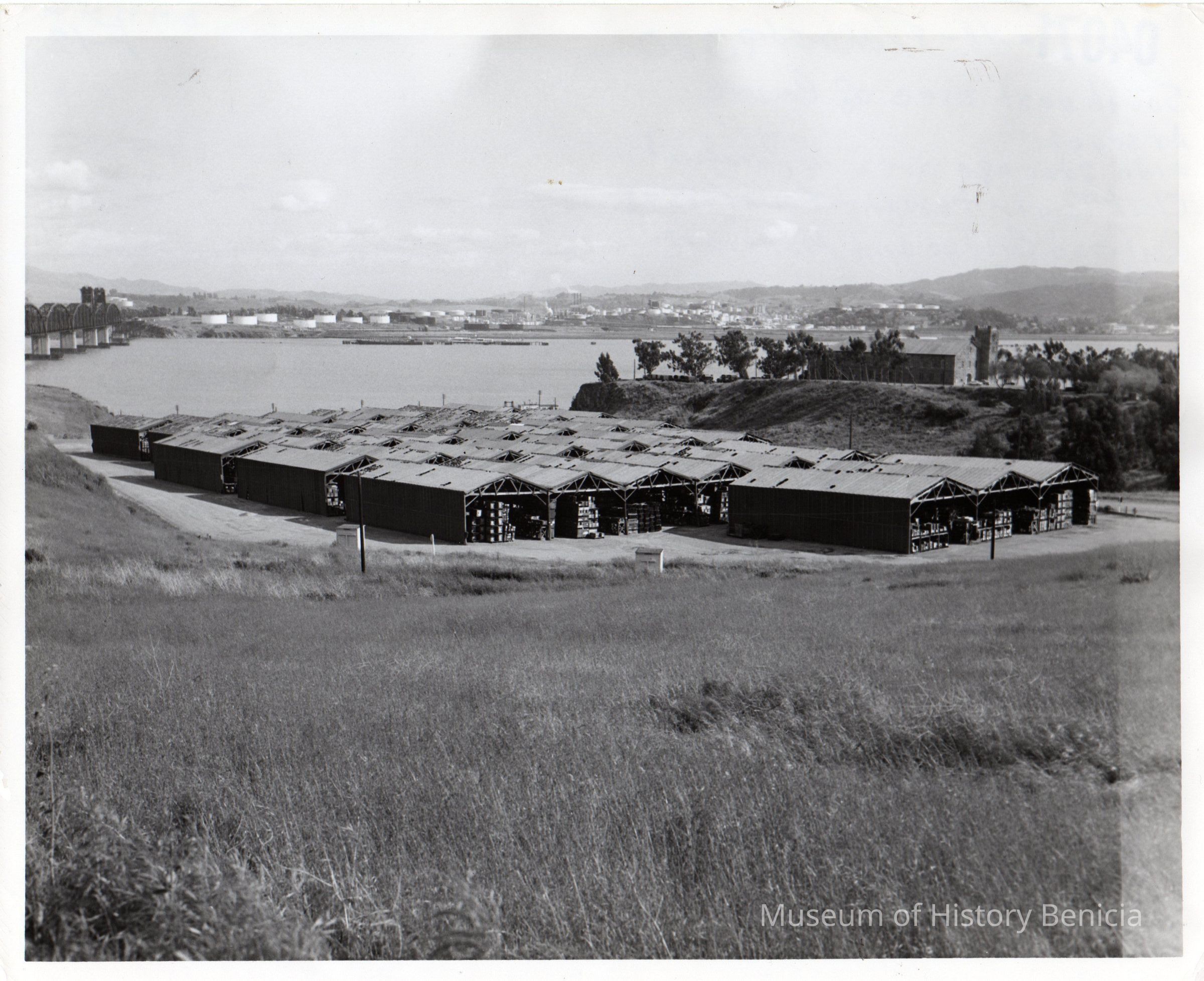 Black and white photo of southwest area of Benicia Arsenal. Storage area in front, Clock Tower at right (built 1859). Railroad bridge and Martinez in background.Collection