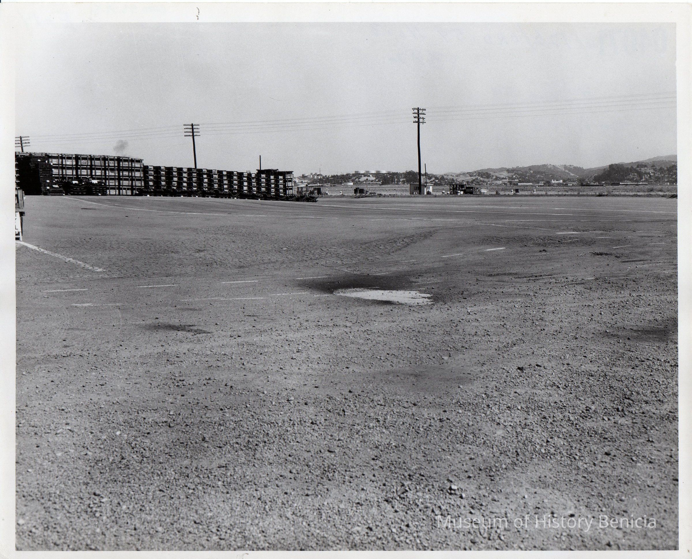 Storage area, lower southeast area, Benicia Arsenal. B/W photo.