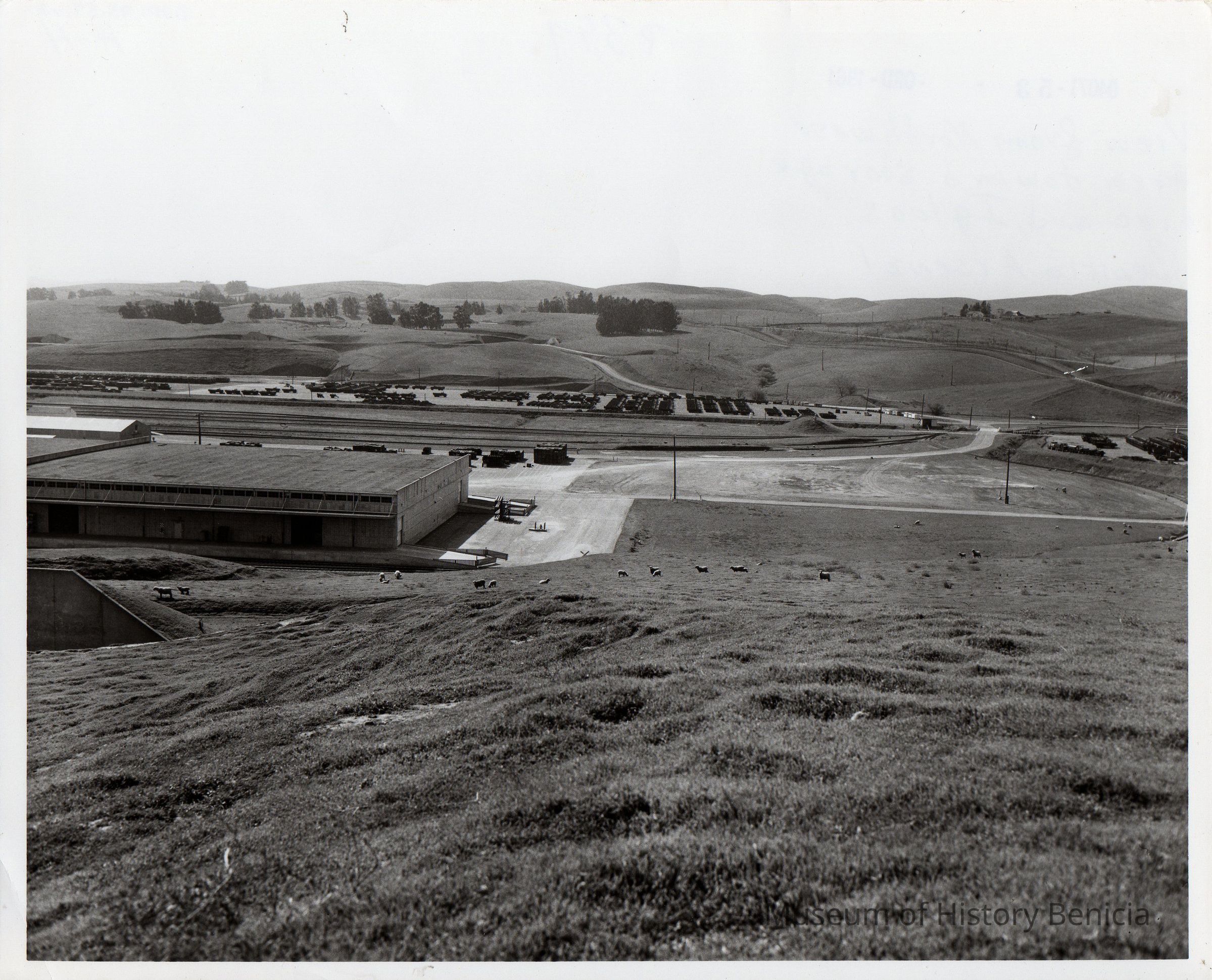 View from northwest area toward storage area and igloos, Benicia Arsenal. Black and white photo.