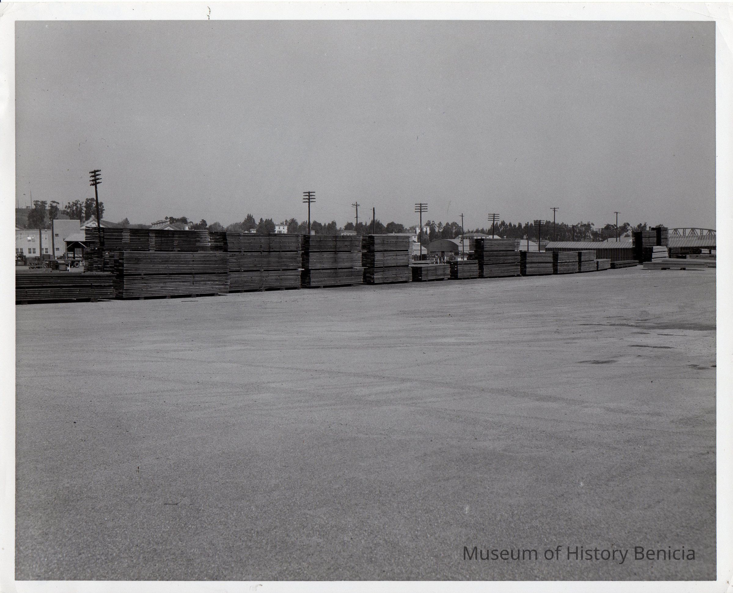 Lumber storage area, lower south area of Benicia Arsenal. Black and white photo.