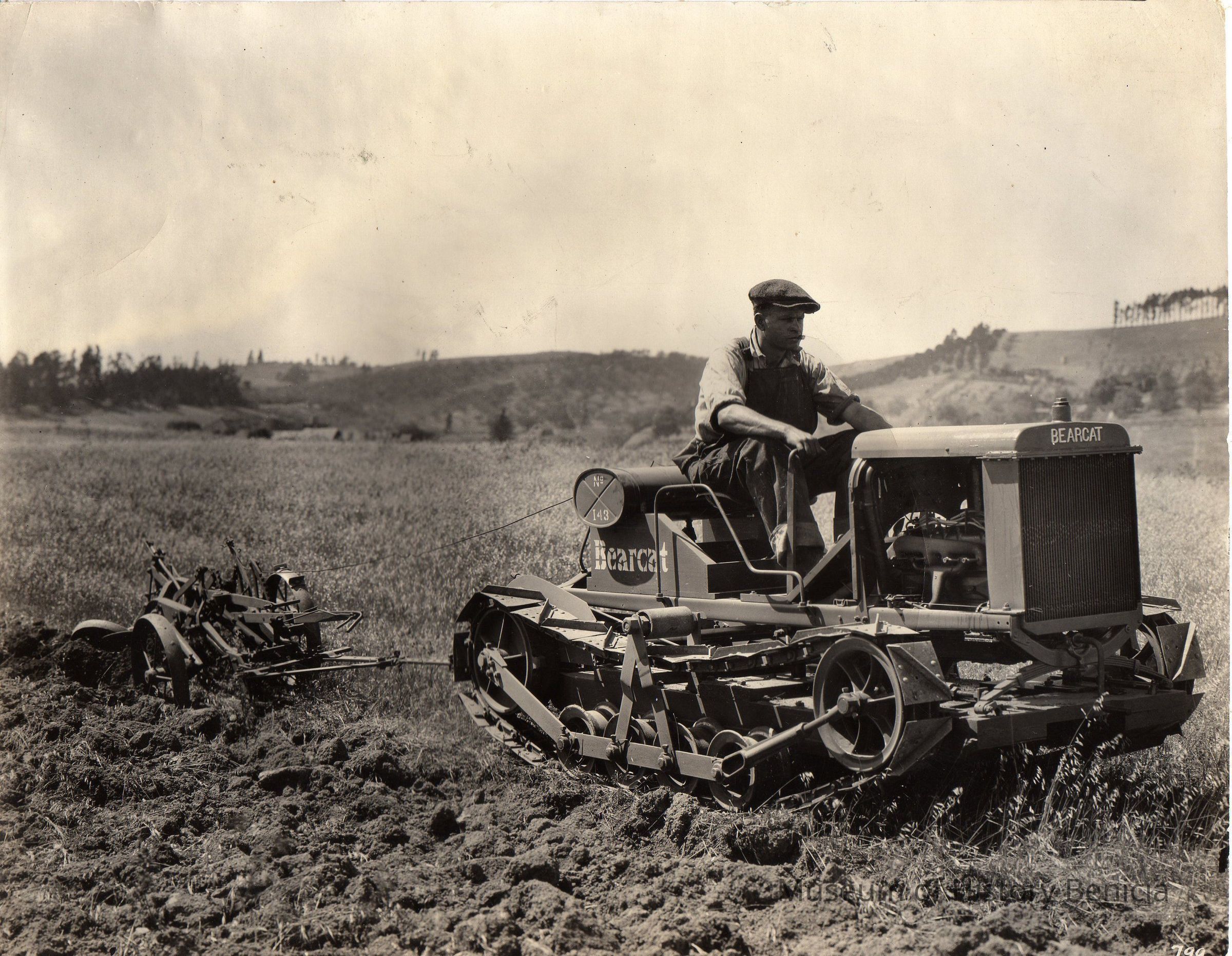 Man in Bearcat Yuba tractor, discing. Mr. Barkly driving on farmland where tractor is working. Location between East 2nd and 3rd Streets just north of 780 Freeway. B/W photo.Collection