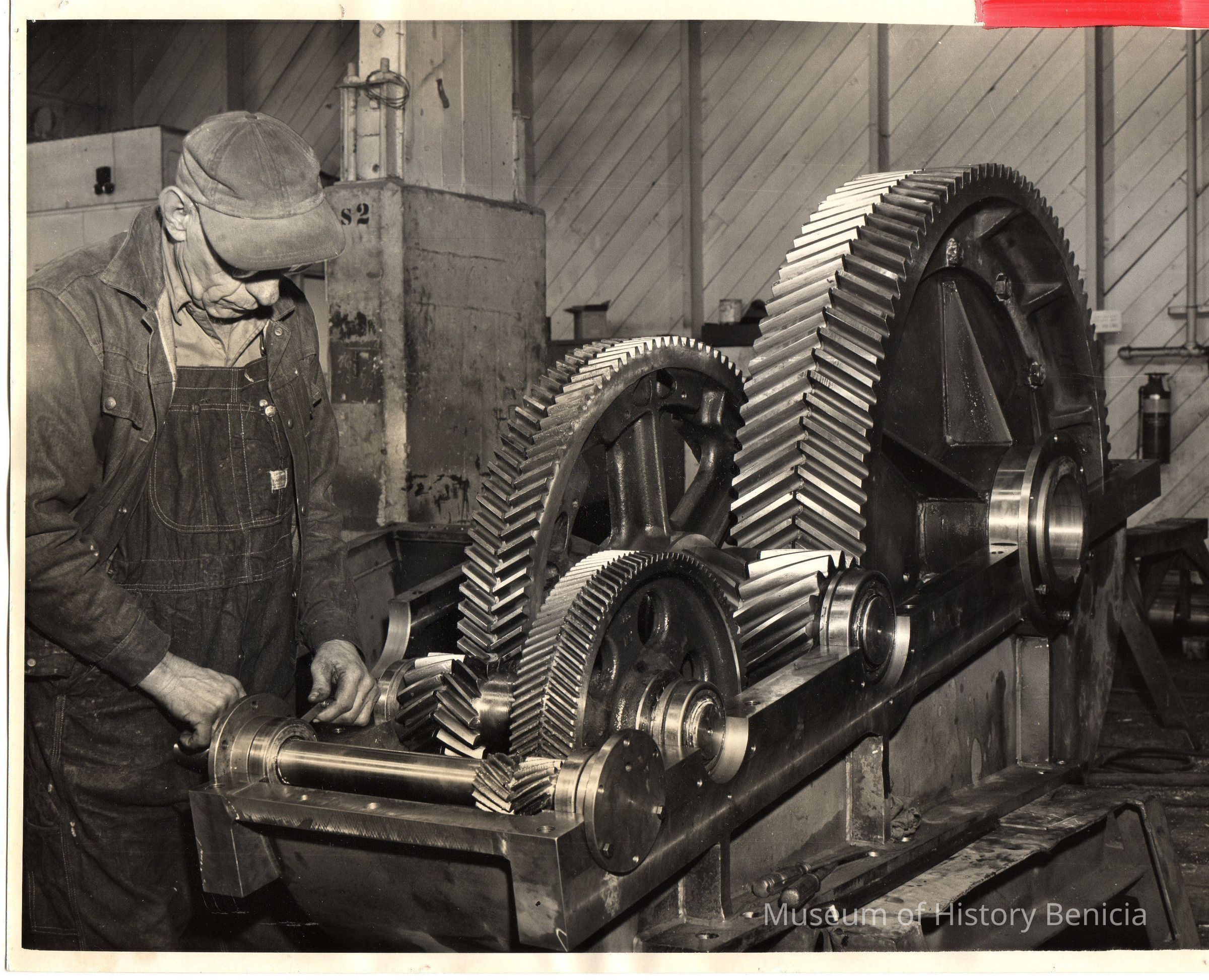 A man working on machinery for emergency gate hoists and tainter gate hoists, Barkley Dam, Gust. K. Newberg Const. Co. Black and white photo.Collection