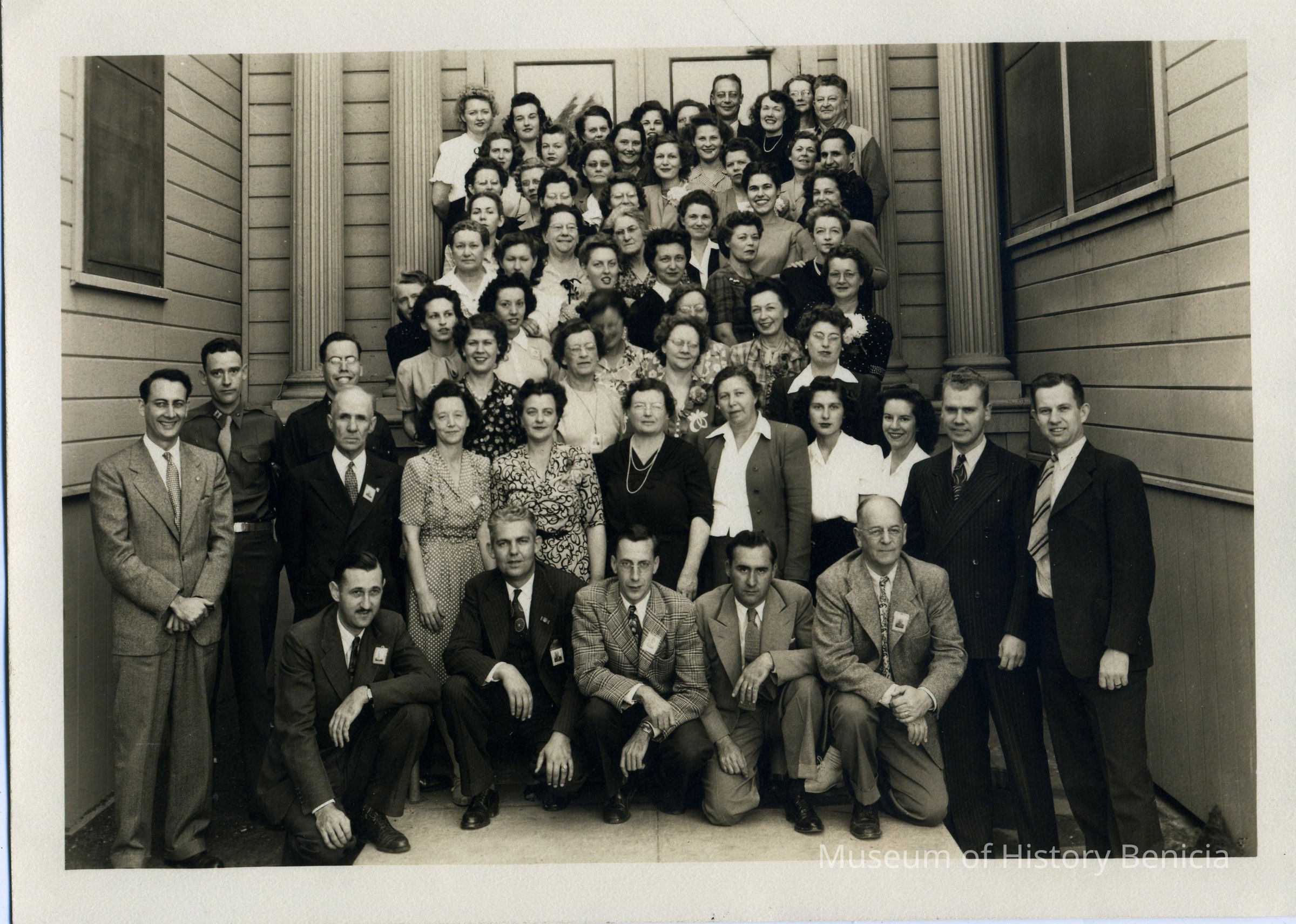 B/W group photo of men and women on steps of building with double doors flanked by columns. "Bldg. 47?" on back in pencil. "Group photo of office staff people-- Ruth 2nd from right, 2nd from top row" notes by Gladys Wold.Collection