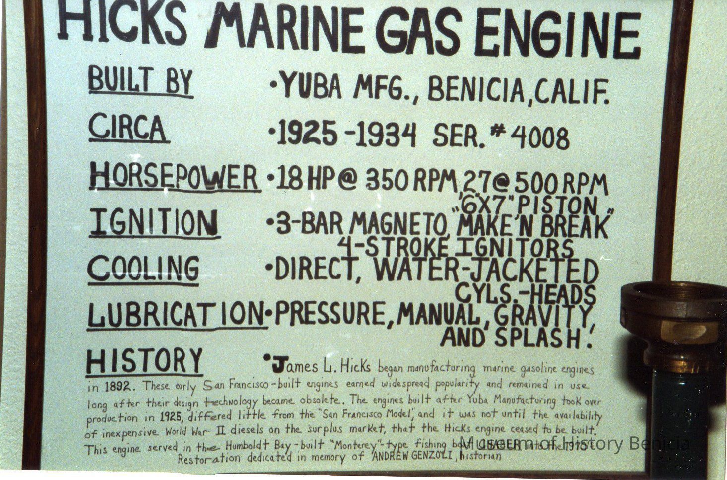Color photo of Hicks Marine Gas Engine built by Yuba Mfg. Co., Benicia c. 1925-1934, ser.#4008. Served in fishing boat in 1944; now is in Eureka Maritime Museum.Collection
