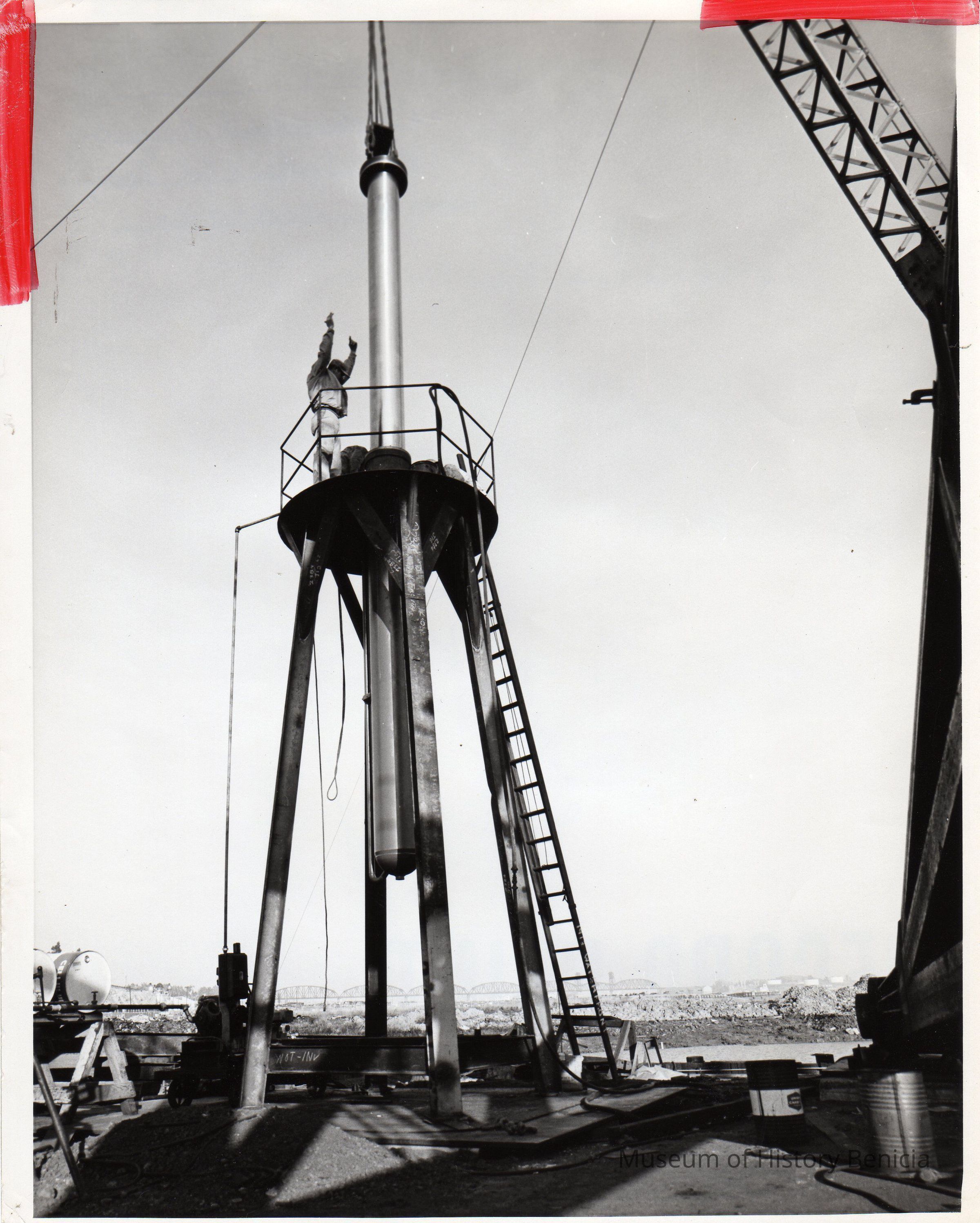 Hydraulic system and cylinder casings used at missile testing site in New Mexico. Manual Christo reported that the Petroleum Combine and Engineering Co. was a sub-contractor. B/W photo.Collection